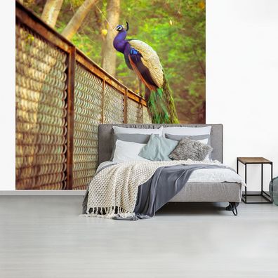 • Fototapete - 280x280 cm - Pfau - Federn - Zaun (Gr. 280x280 cm)
