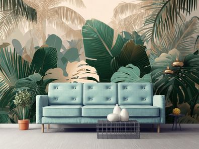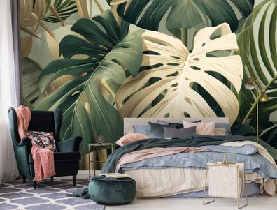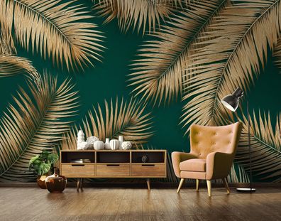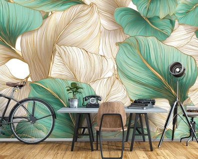 Vlies Fototapete Blätter Grün Gold TAPETE XXL Wohnzimmer Schlafzimmer