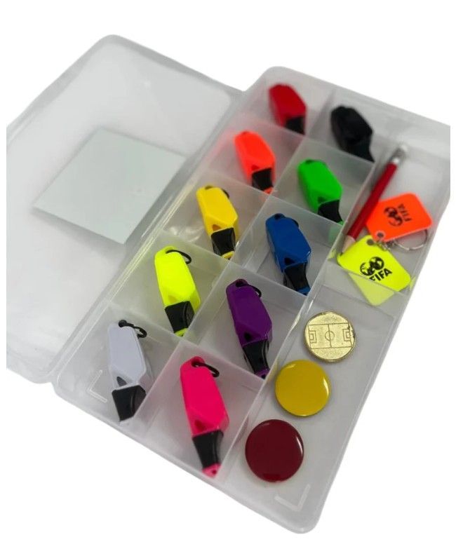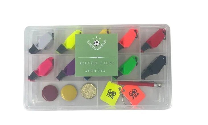 Set mit 10 Fox40 Fuziun CMG Schiedsrichterpfeifen in 10 Farben (Weiß, Neon-Gelb, Gelb, Orange, Rot, Pink, Violett, Blau, Grün, Schwarz). Ergonomisches Design mit CMG-Mundstück, kugellos, 3-Kammer-Bauweise, Haltering im schwarzen Zink-Finish. Sehr laut: ca. 118 dB, hörbar bis 1,5 km, übertönt Umgebungsgeräusche. Zubehör: 2 Wählmarken, Schiedsrichtermünze, Bleistift mit Clip & Radiergummi, FIFA-Schlüsselanhänger. Keine Rückgabe aus hygienischen Gründen.