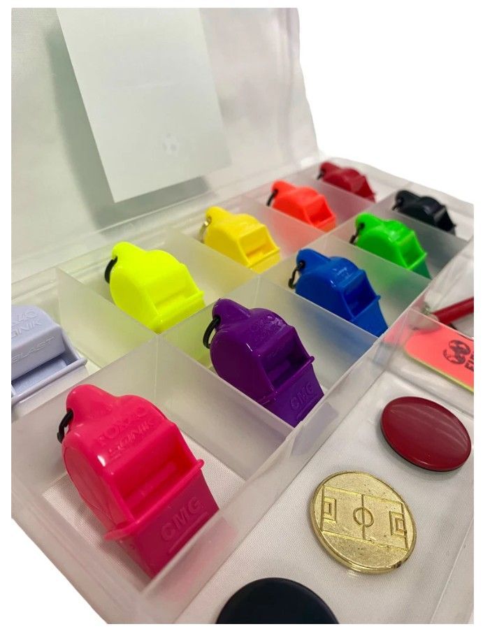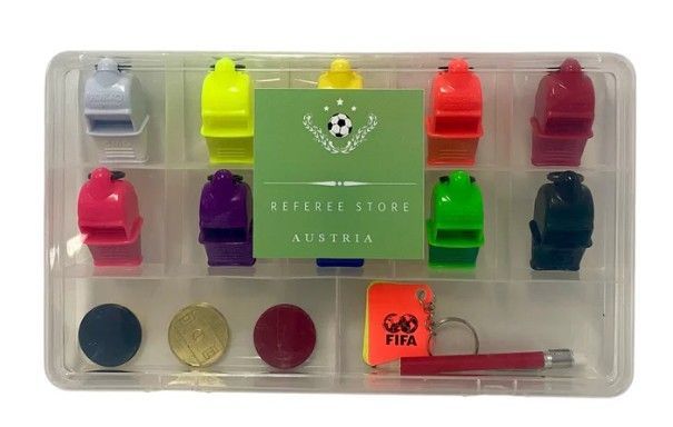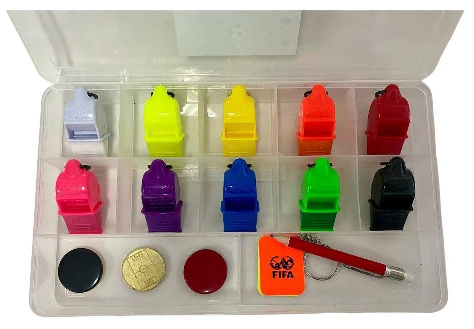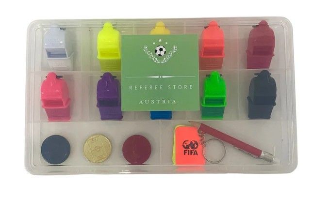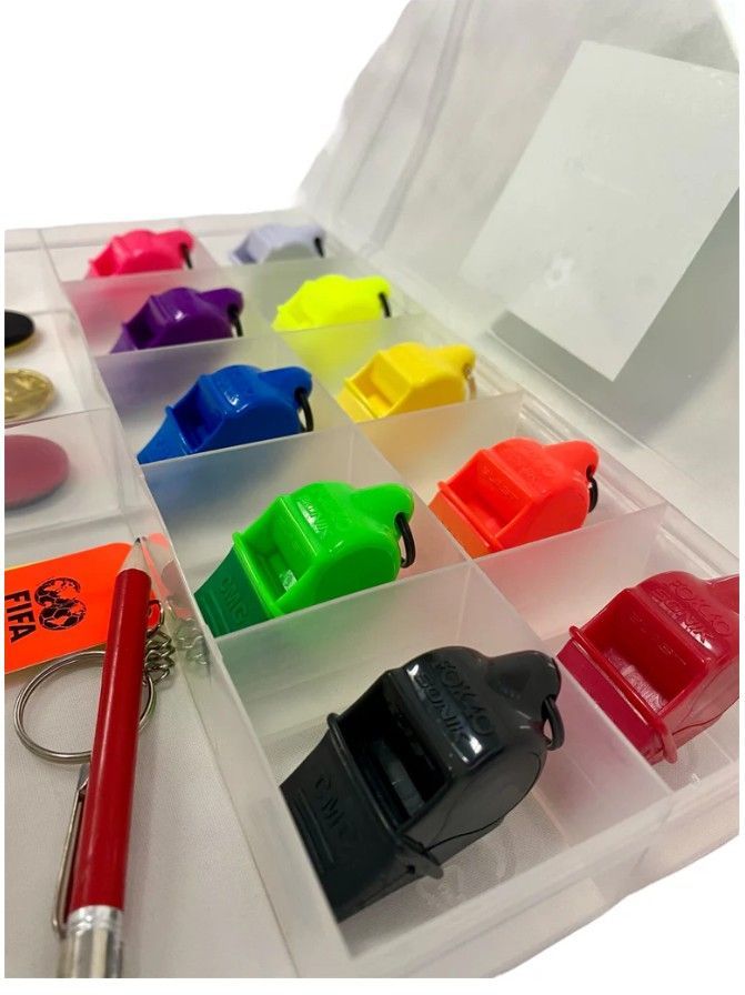 10 Fox 40 - Sonik Blast CMG Pfeifen in verschiedenen Farben + Zubehör Fox40 - Schiedsrichterpfeife Classic Nr. 1 bei allen Spitzen-Schiedsrichtern die weltweit meistverkaufte Pfeife extrem durchdringender Ton, Lautstärke ca. 110 dB In den Farben: Weiß NeonGelb Gelb Orange Rot Pink Violett Blau Grün Schwarz Ebenfalls enthalten: 1x Wählmarke rot/schwarz 1x Wählmarke gelb/schwarz 1x Schiedsrichtermünze Gold 1x Bleistift mit Halteclip und Radiergummi 1x Fifa Schlüsselanhänger