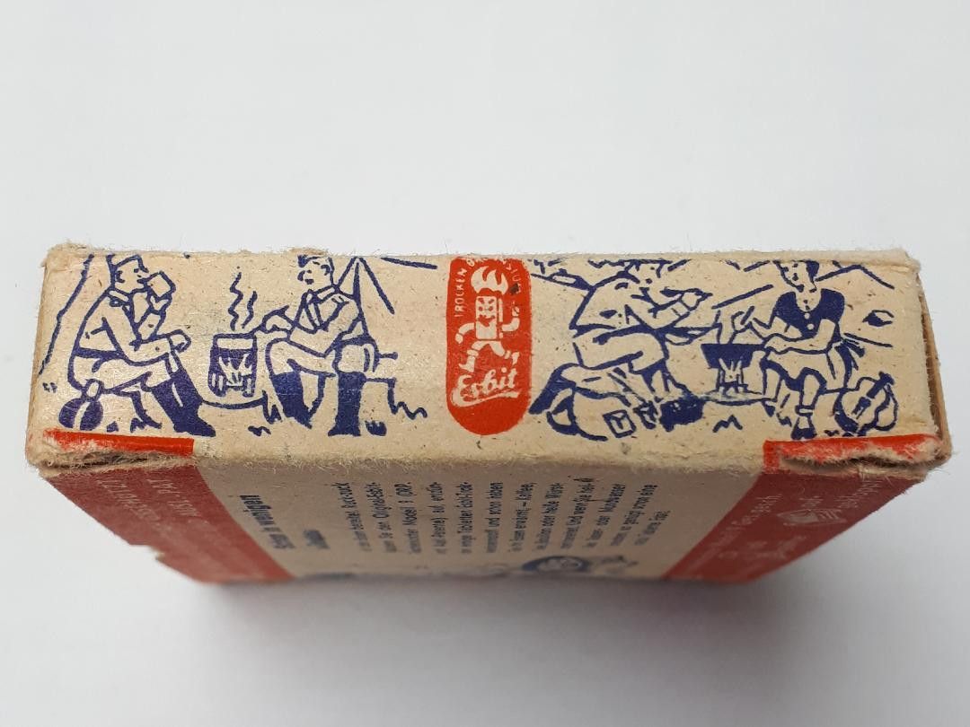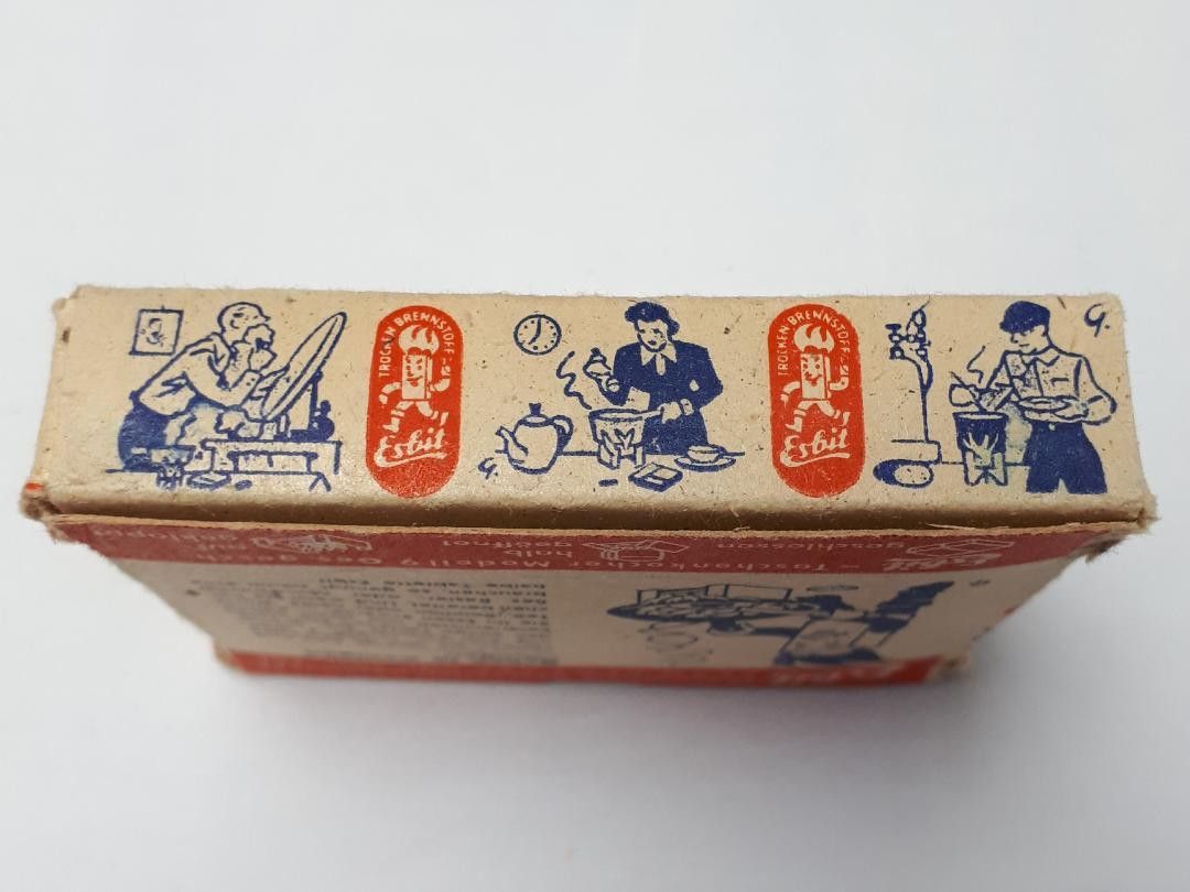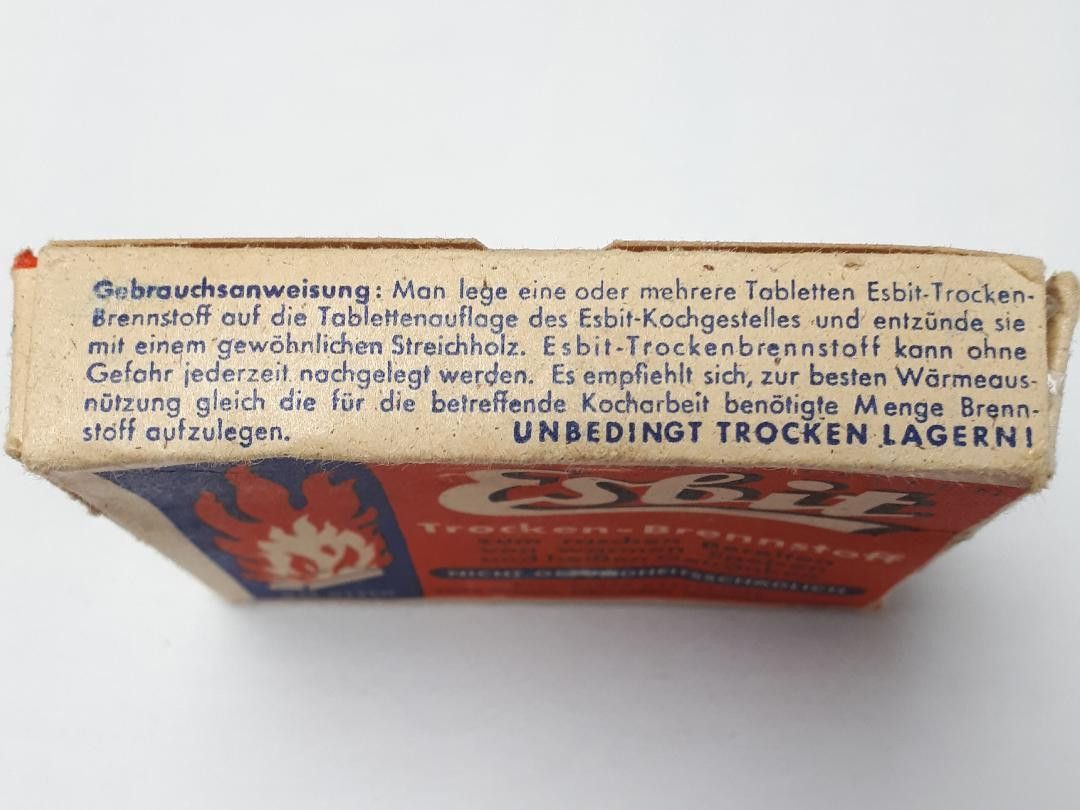 Frühe Bundeswehr Esbit Klappkocher K 12 * Esbitkocher: frühe Bundeswehr - gleich WH * Esbitverpackung: Restbestände WH * Inhalt: 6 Tabletten Nachkriegsproduktion Zustand: gut - gebraucht mit kleinen Gebrauchsspuren