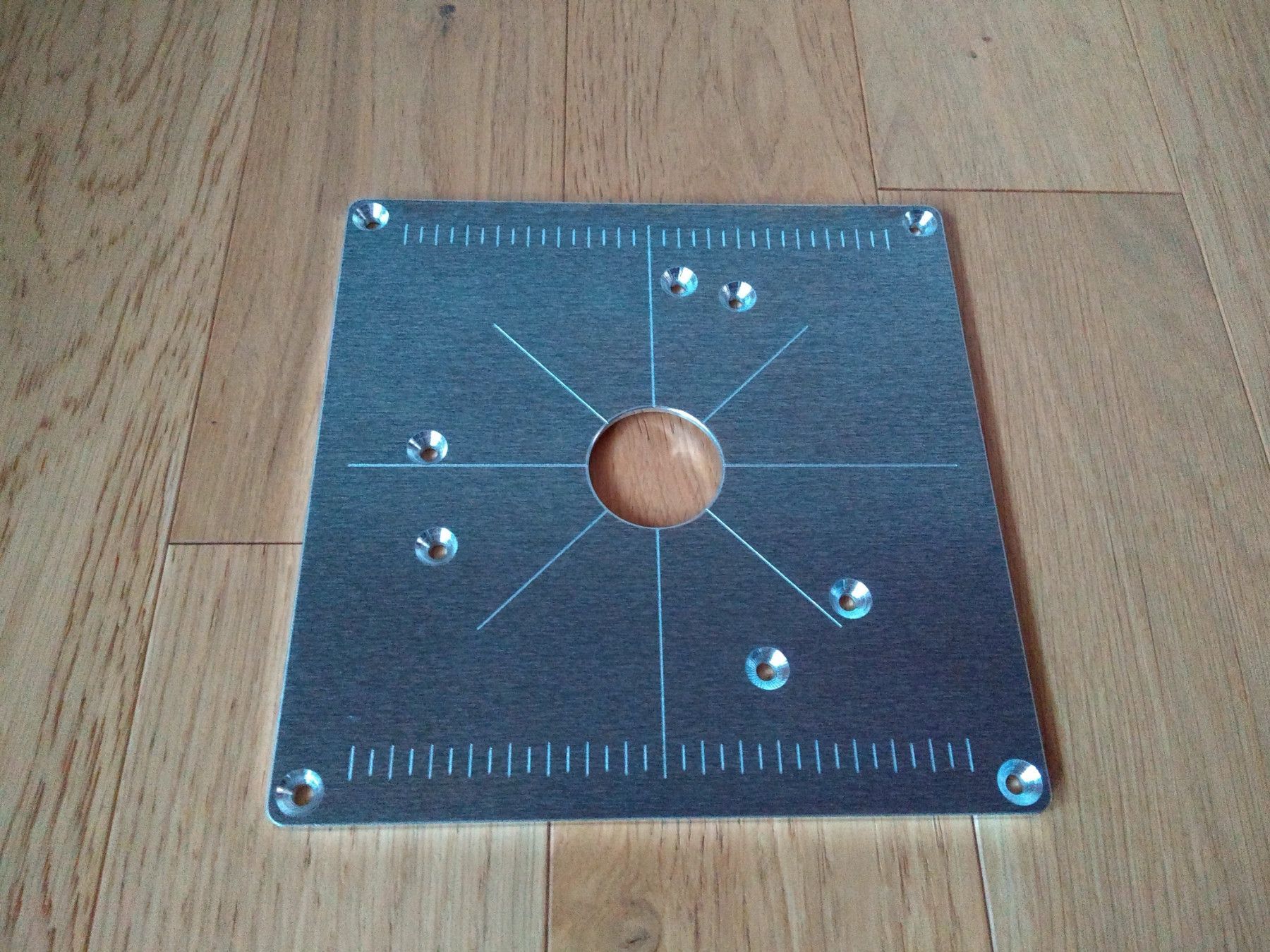 Einlegeplatte, Befestigungsplatte für Einhell TE-RO 1255 E aus Aluminium (Walzplatte nach EN 485-3 4) Länge: 200mm Breite: 200mm Höhe: 6mm Bohrung: 40mm gerundete Ecken, R5+0,5 gravierte 5mm Skala und 45°- Winkellinien Befestigungsbohrungen in den Ecken (90° Senkung, Durchmesser 5,5mm) Eigene Herste