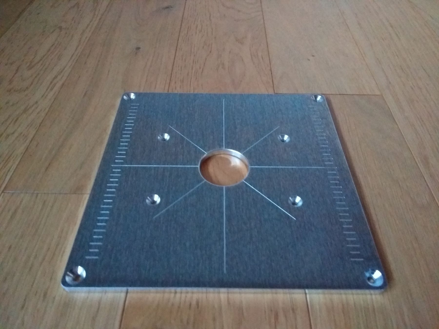 Einlegeplatte, Befestigungsplatte für Einhell TC-RO 1155 E aus Aluminium (Walzplatte nach EN 485-3 4) Länge: 200mm Breite: 200mm Höhe: 6mm Bohrung: 40mm gerundete Ecken, R5+0,5 gravierte 5mm Skala und 45°- Winkellinien Befestigungsbohrungen in den Ecken (90° Senkung, Durchmesser 5,5mm) Eigene Herste