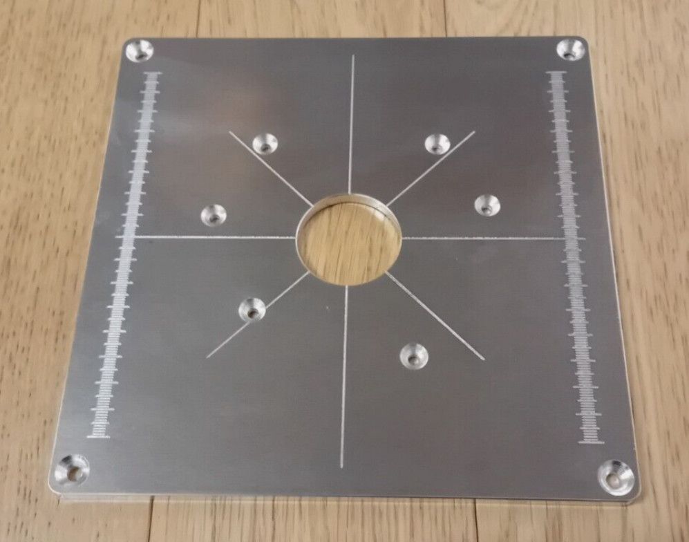 Einlegeplatte, Befestigungsplatte für Festool OF1010 EBQ mit 1mm Skala Nicht für die OF1010REBQ! aus Aluminium (Walzplatte nach EN 485-3 4) Länge: 200mm Breite: 200mm Höhe: 6mm Bohrung: 40mm gerundete Ecken, R5+0,5 gravierte 1mm Skala und 45°- Winkellinien Befestigungsbohrungen in den Ecken (90° Sen