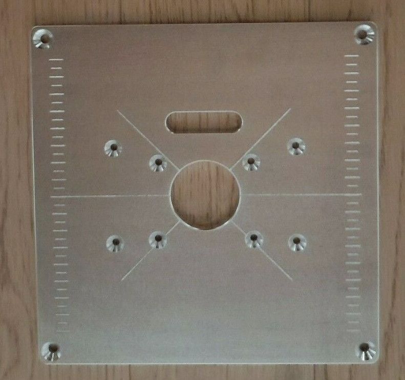 Einlegeplatte, Befestigungsplatte für Makita RT0700, Makita DRT50Z, RT0702 aus Aluminium (Walzplatte nach EN 485-3 4) Länge: 200mm Breite: 200mm Höhe: 6mm Bohrung: 40mm gerundete Ecken, R5+0,5 gravierte 5mm Skala und 45°- Winkellinien Befestigungsbohrungen in den Ecken (90° Senkung, Durchmesser 5,5m