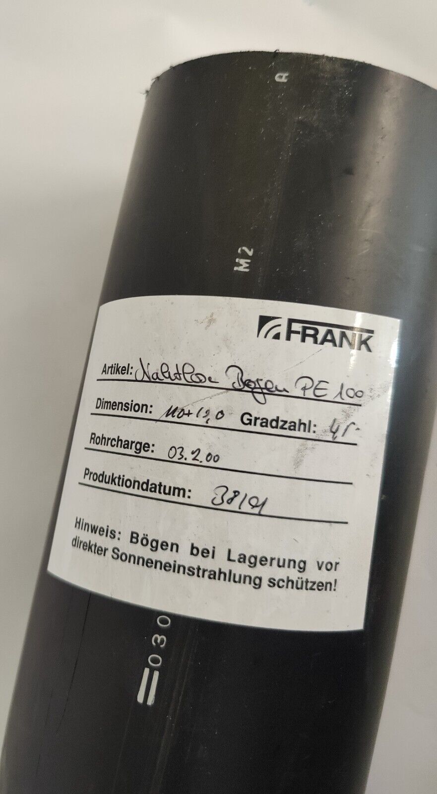 Wir bieten an: Frank nahtloser Bogen 45° Durchschitt 110 mm Länge 610 mm PE 100 PN 16 SDR 11 schwarz Artikel-Nr.: 011011 Maße: Durchmesser 110 mm Länge 610 mm Schenkellänge 340 mm 270 mm Nennweite: DN 110 Modell: nahtloser Bogen 45° Material: PE 100, schwarz max. Betriebsdruck: PN 16 max. Betriebste... Mehr