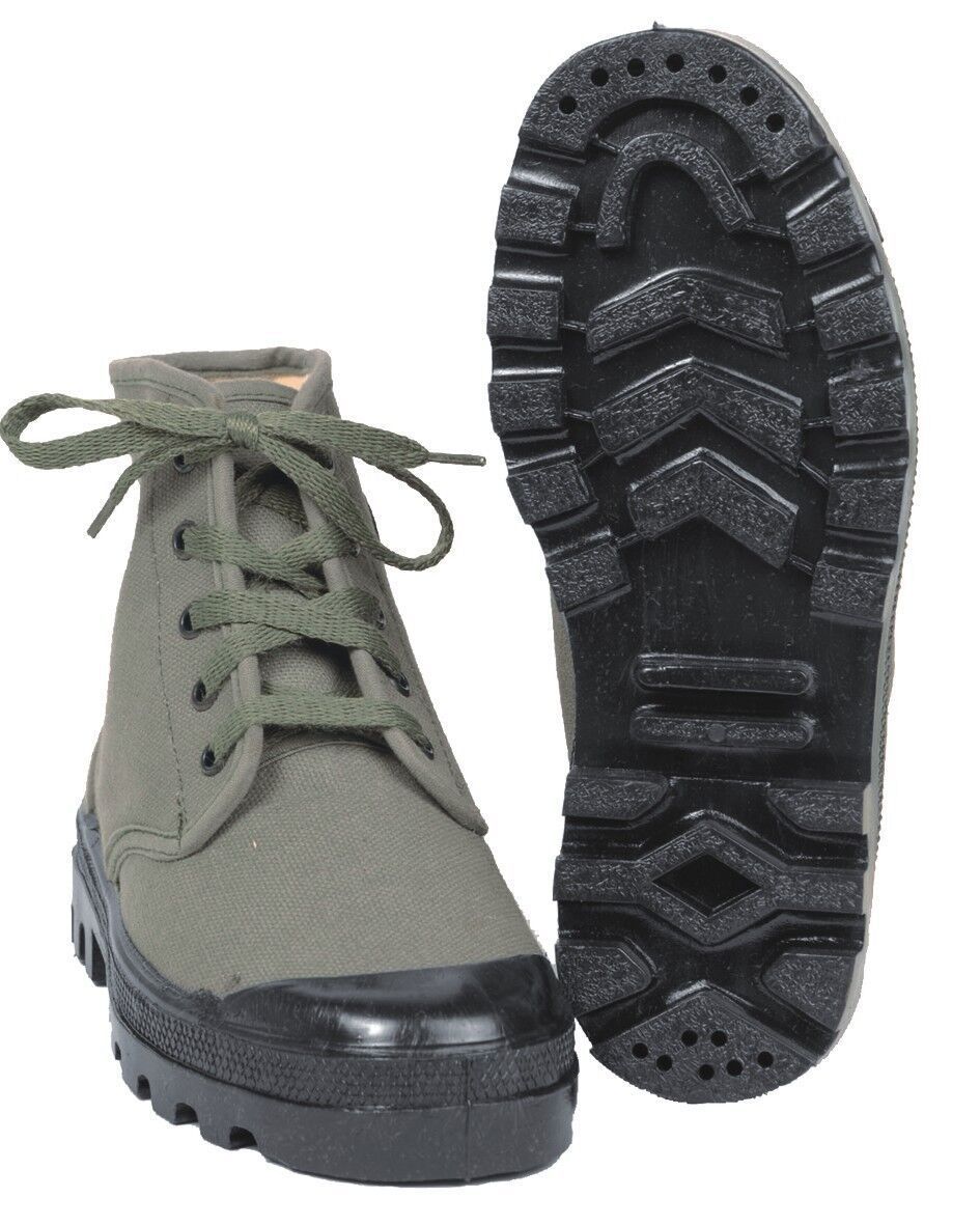 Französische Commandoschuhe Strapazierfähige Commando-Schuhe aus Segeltuch (Canvas). Ausführung: kurz (5-Loch) Hersteller: Sturm (MiL-Tec) Farbe: oliv Obermaterial: 100% Baumwolle Canvas Futter: 100% Baumwolle Laufsohle: Gummi Innensohle: EVA (sehr hochwertiger, hervorragend isolierter Schaumstoff,