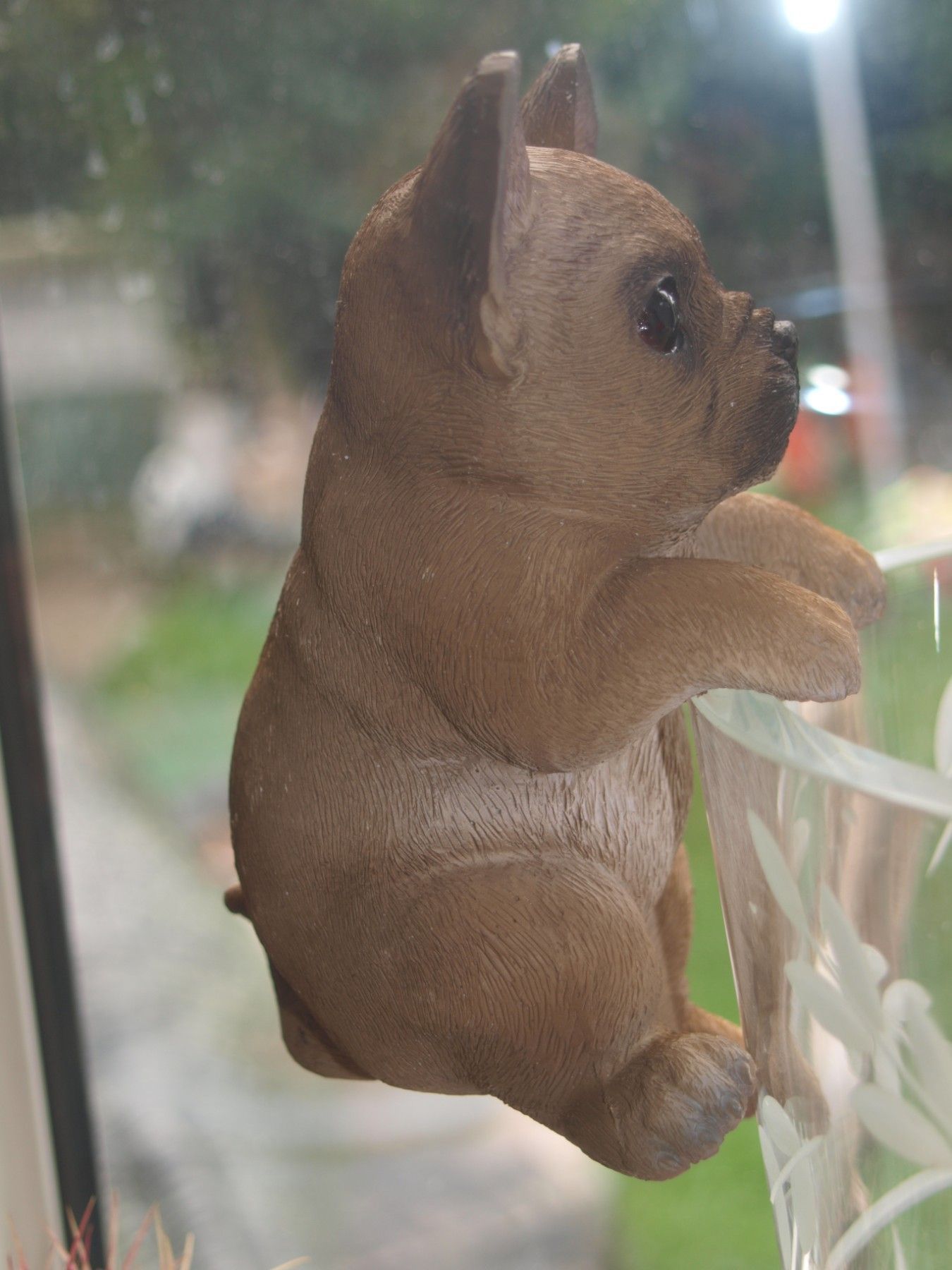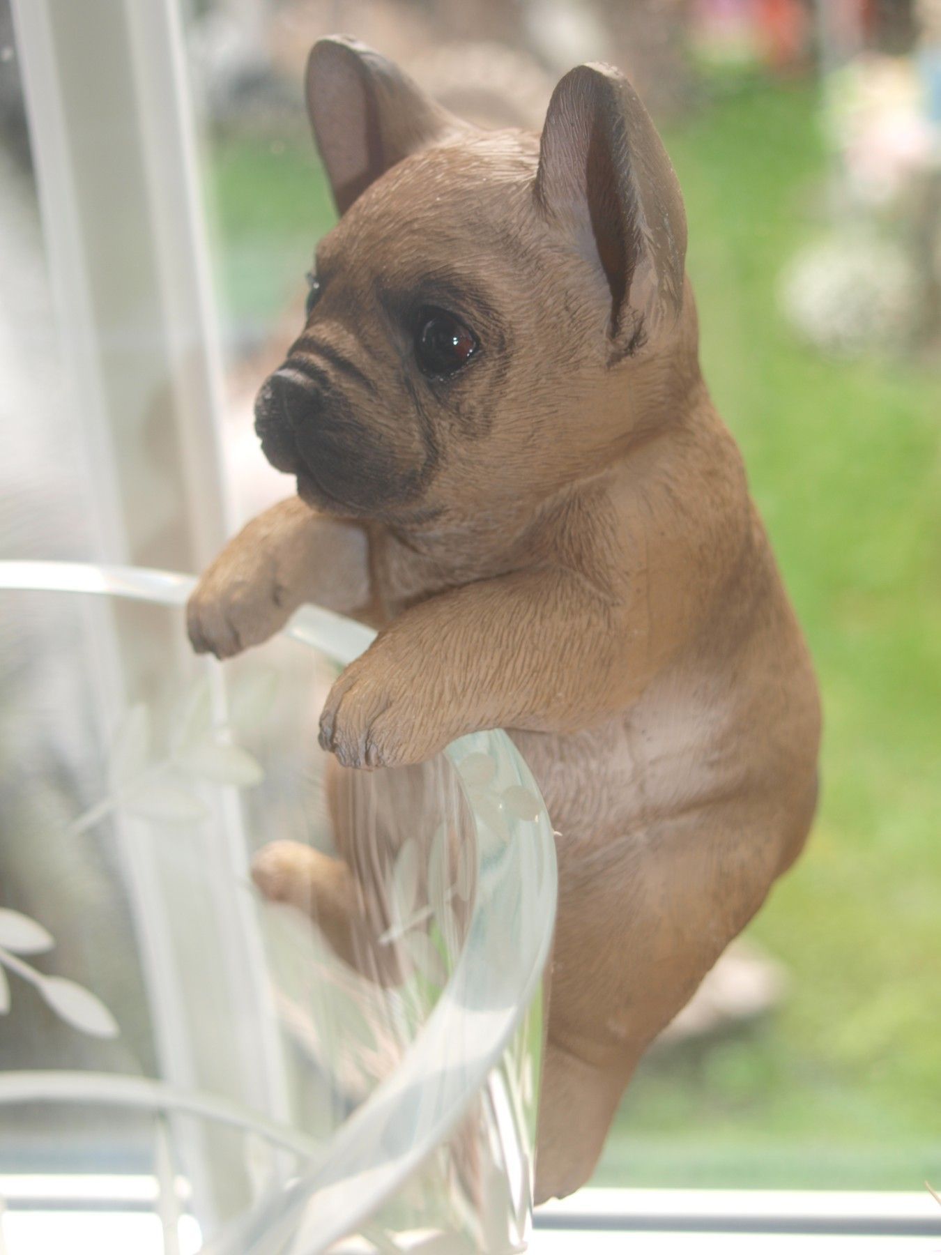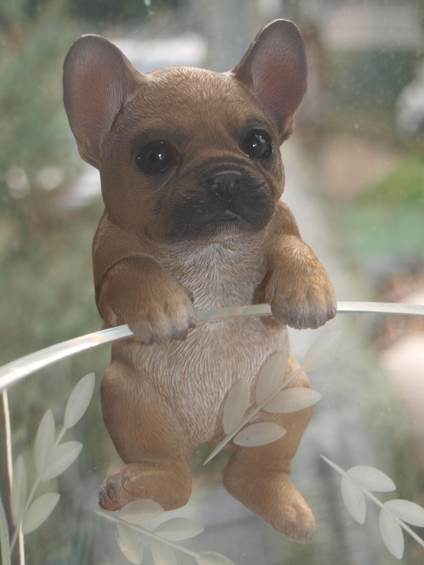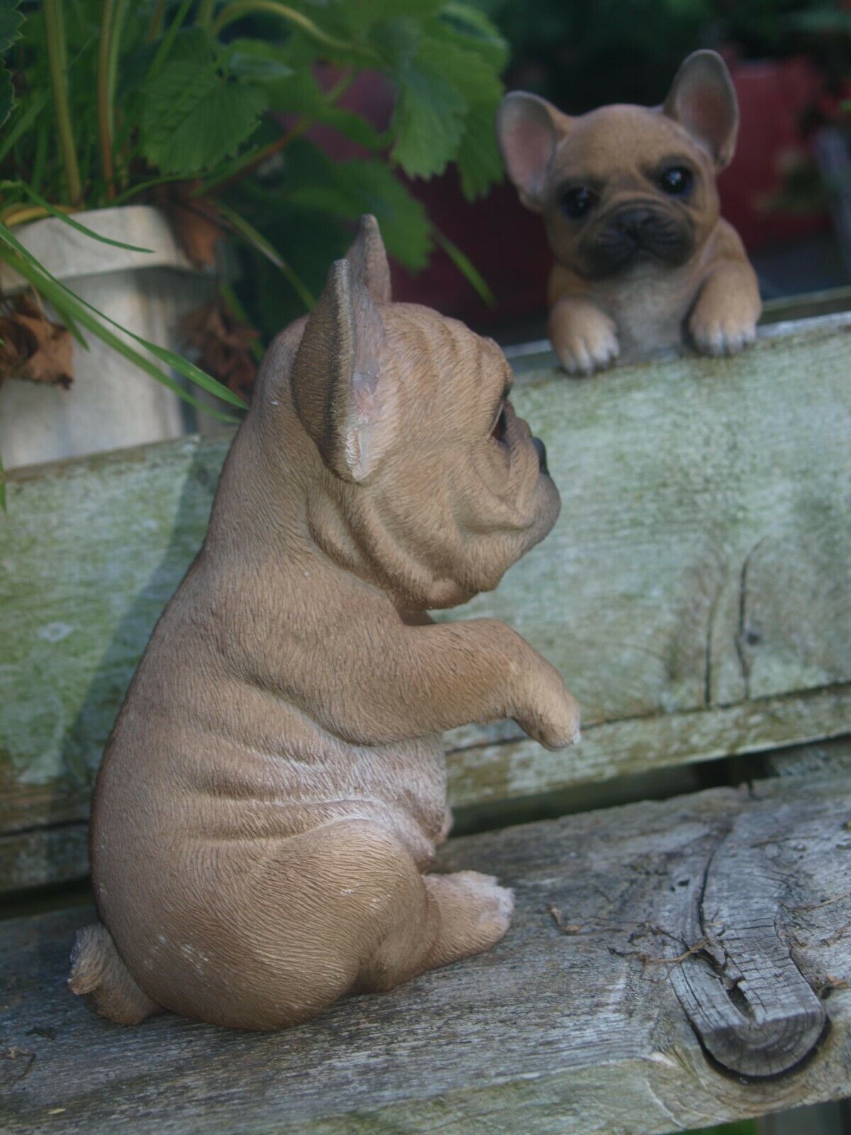 niedliche französische Bulldogge Welpe sitzend Pfote hoch, hängend (z.B am Blumentopf) oder als Set Beide lebensecht von Hand bemalt sitzend ca Höhe 20cm Breite 16cm Tiefe 14cm hängend ca Höhe 16cm Breite 8cm Tiefe 8cm wetterfestes Polyresin
