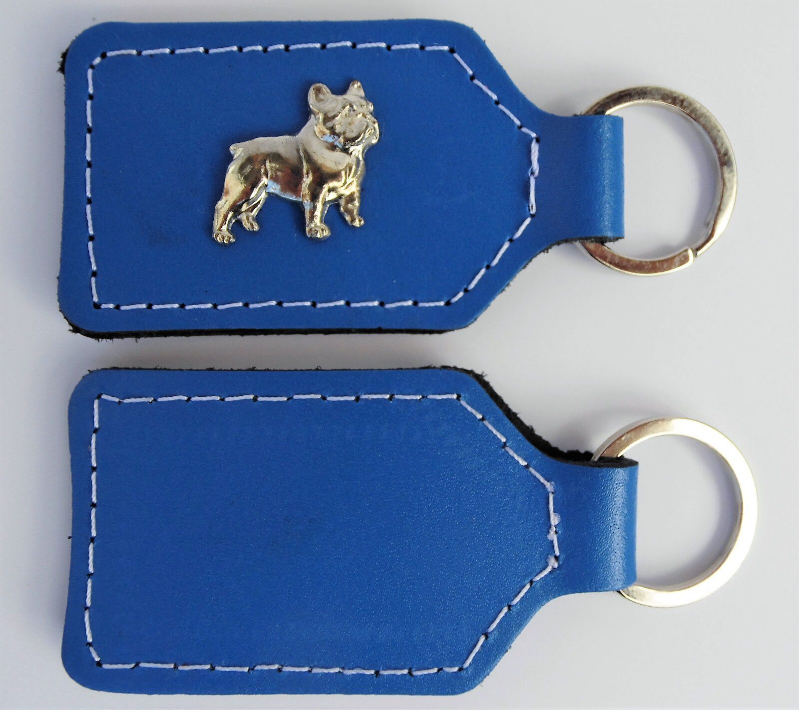 Französische Bulldogge - Schlüsselanhänger Metallaplikationen, Echt LEDER - BLAU