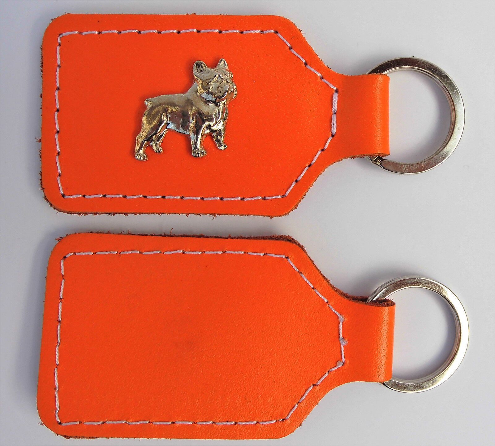 Schlüsselanhänger Metallaplikationen Echt LEDER - *** Französische Bulldogge *** *** ORANGE *** verschiedene Farben **** Aus Rinder Leder **** Stabiles Federring - Durchmesser 25mm **** Abmessung : 9cm x 4 cm (mit Befestigungsring) **** Sehr robust **** Verziert mit tollen Metallaplikationen**** Mad