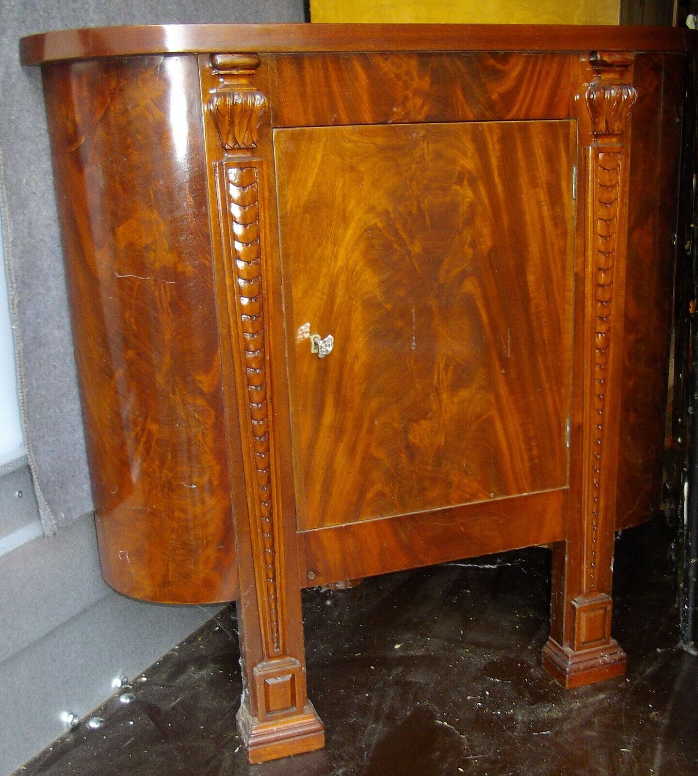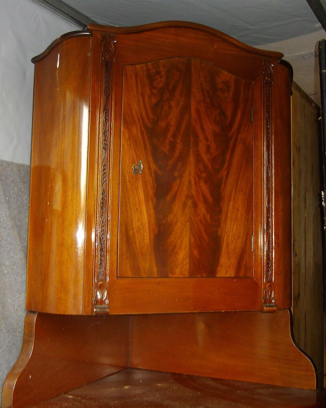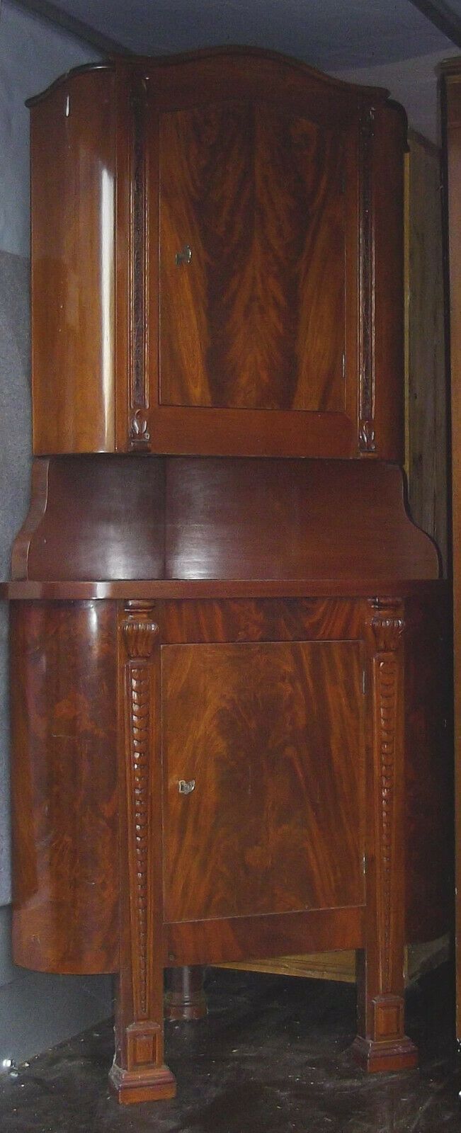 Eckschrank um 1850. Herkunft: Frankreich. Material: Mahagoni-Furnier hell. Zwei-teilig. Sehr gute Erhaltung! Maße: H 180, B 86, Schenkeltiefe 64 cm. Lieferung im Umkreis von 30 km frei Haus! Sonst Transport mit Spedition möglich (je nach Angebot und Entfernung!). Der angegebene Versandpreis bezieht