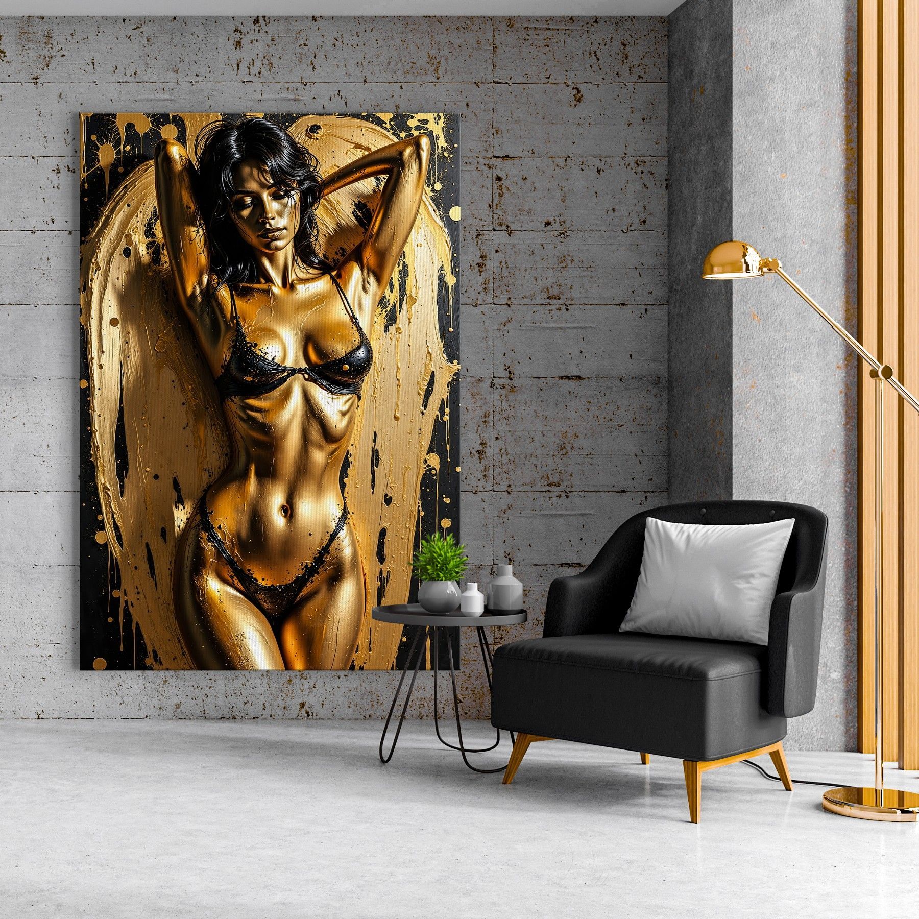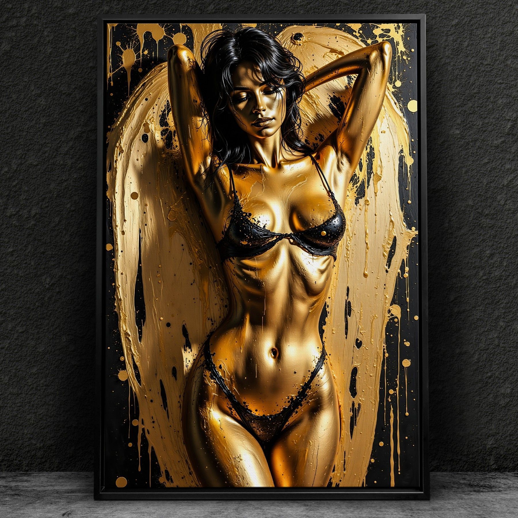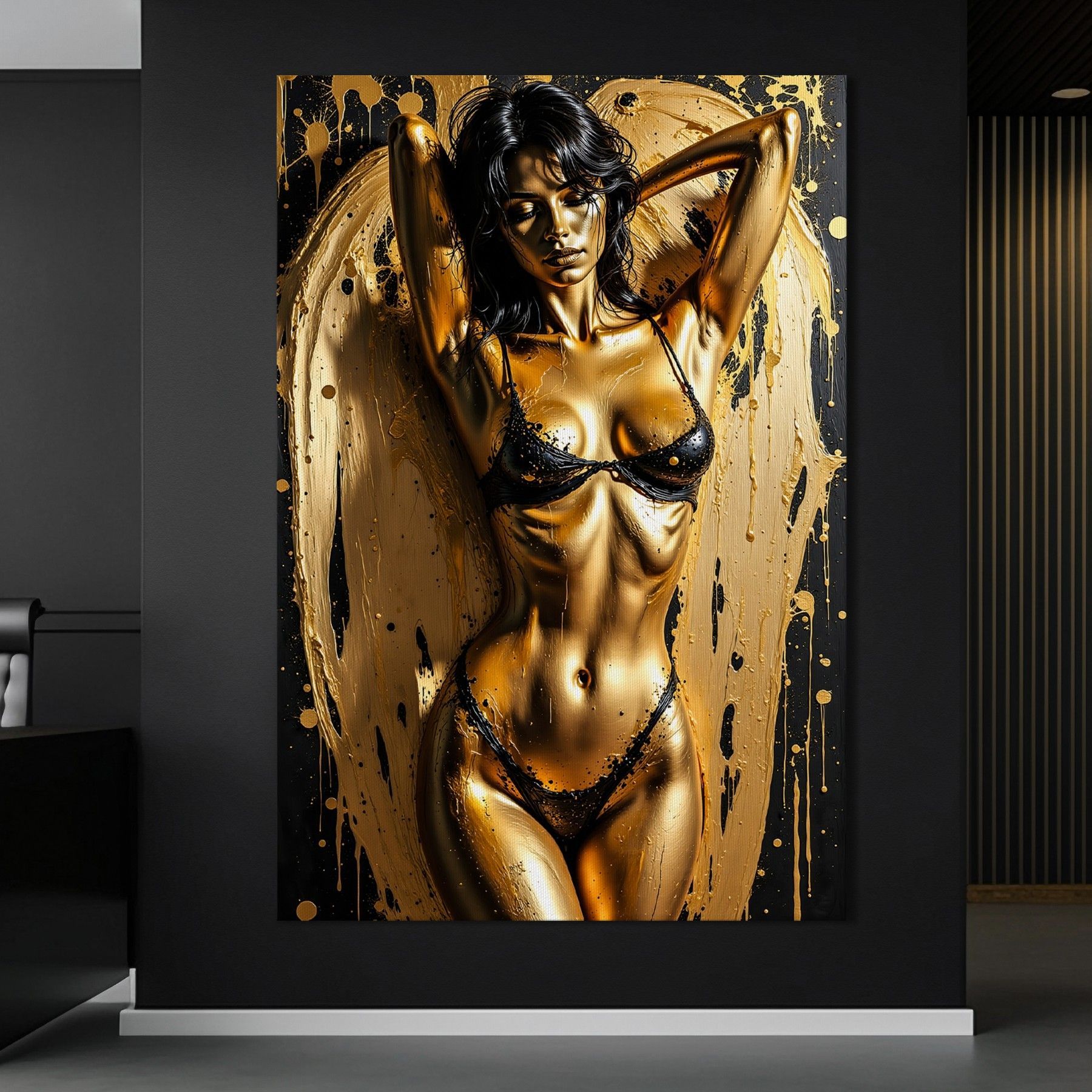 Frau mit Engelsflügeln, Erotische Gold Wandbild Kunst Leinwand, Acrylglas, Poster rr2