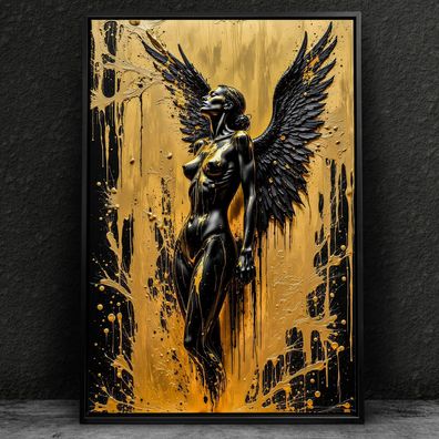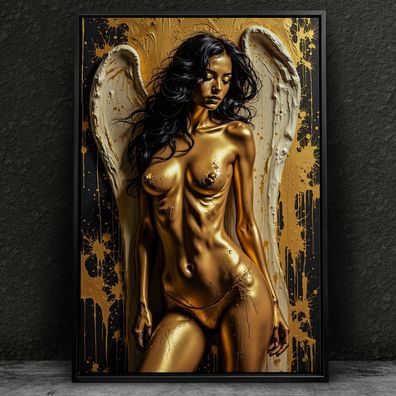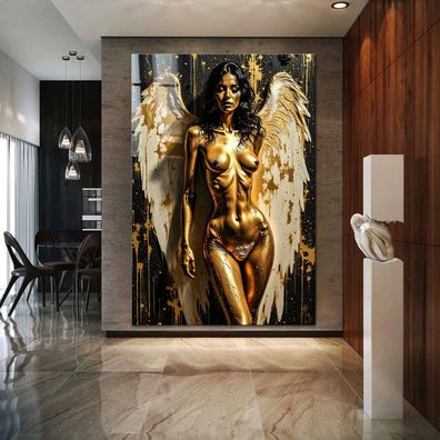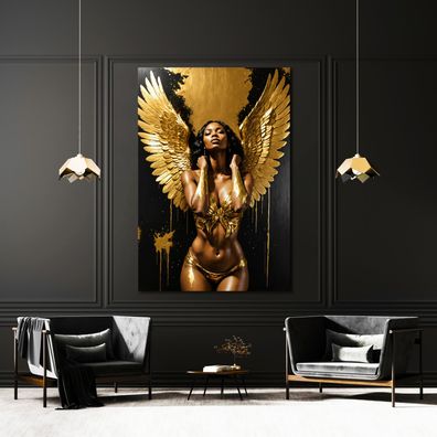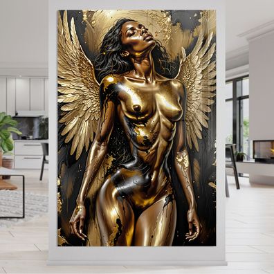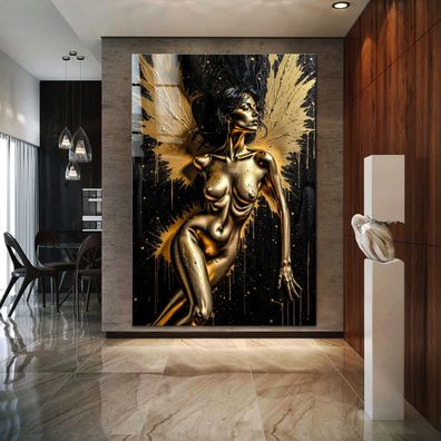 Frau mit Engelsflügeln, Erotische Gold Wandbild Kunst Leinwand, Acrylglas, Poster