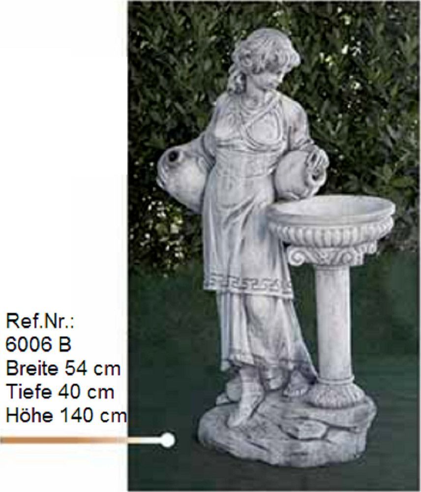 Eine wunderschöne weibliche Gartenskulptur, ähnlich wie die Ref.Nr. 6006-A, nur mit einen kleinen Brunnen an der Seite, den man auch für Wasserspiele nutzen kann. Die Wasserspiele funktionieren über einer elektrischen Pumpe in einen geschlossenen Wasserkreislauf. Der antike Guss besteht aus Witterung - und frostbeständigem Weißstein und wird in aufwendiger Handarbeit in Andalusien hergestellt.