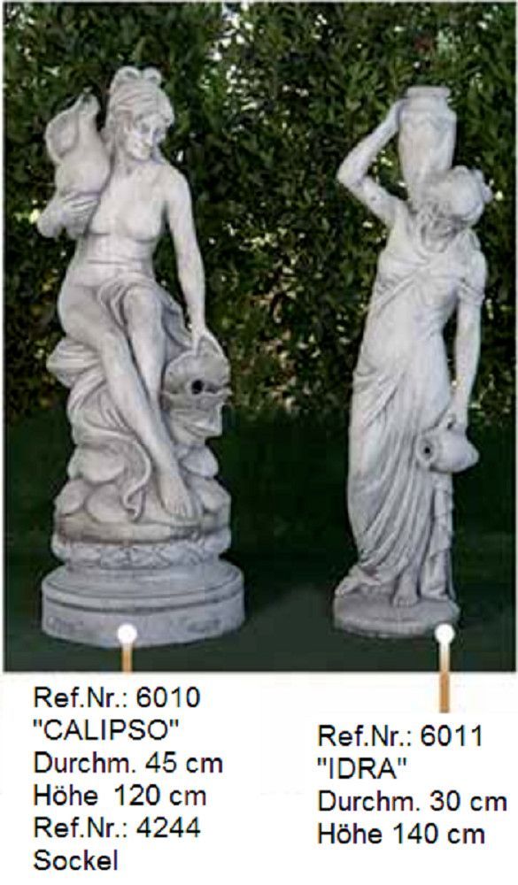 Je eine wunderschöne weibliche Gartenskulptur, die man auch für Wasserspiele in einen Brunnen oder Solo aufstellen kann. Die Wasserspiele funktionieren über einer elektrischen Pumpe in einen geschlossenen Wasserkreislauf. Der antike Guss besteht aus Witterung - und frostbeständigem Weißstein und wird in aufwendiger Handarbeit in Andalusien hergestellt.