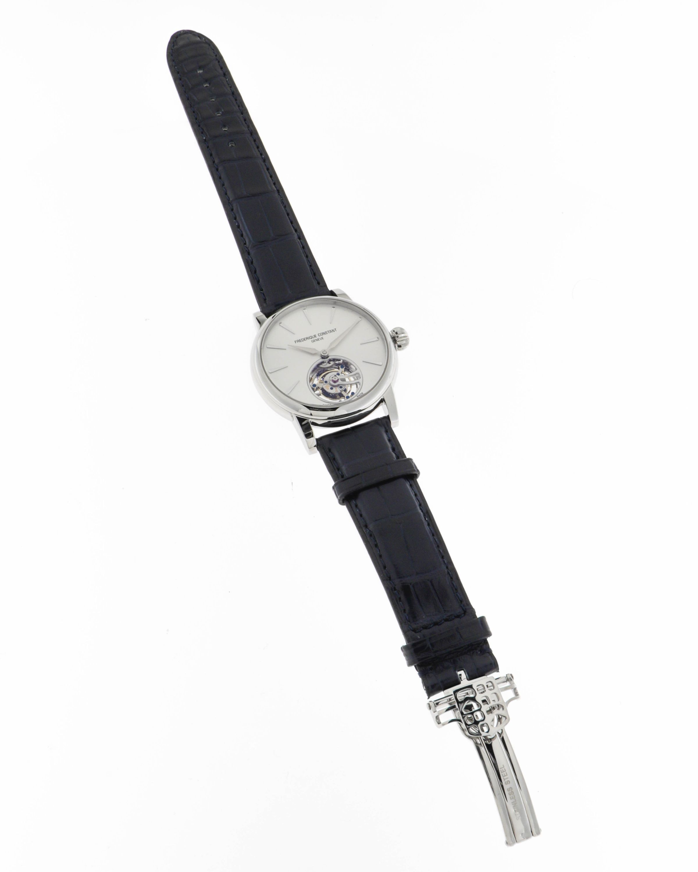 Marke: Frederique Constant Referenz: FC-980S3H6 Geschlecht: Mann, Frau Zifferblattfarbe: Silber Gehäusematerial: Stahl Armbandmaterial: Leder Produktionsjahr: 2024 Bandfarbe: Blau Verschluss: Faltschließe Material Schließe: Stahl class='info_name'>Glasmaterial: Saphir Lünettenmaterial: Stahl Kaliber