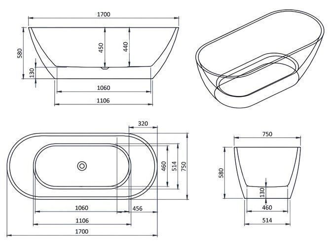• Luxus freistehende Badewanne 170cm / 80cm Designer Acrylwanne-Wanne