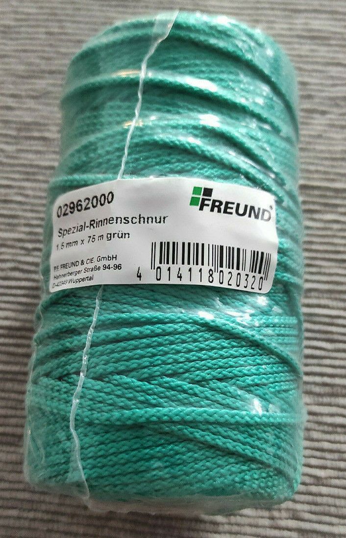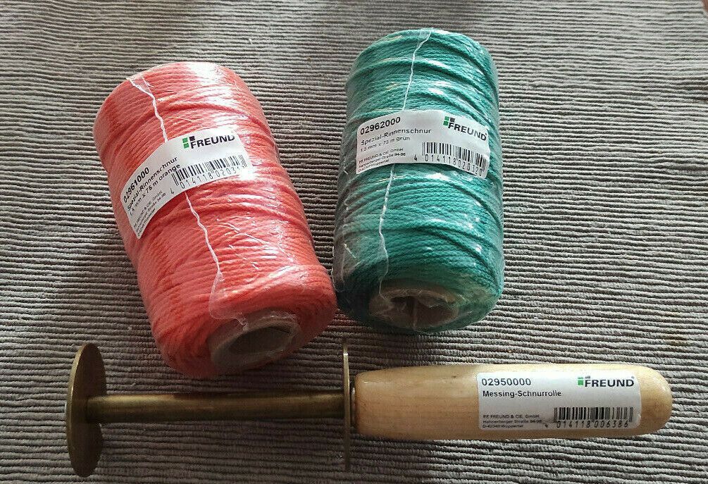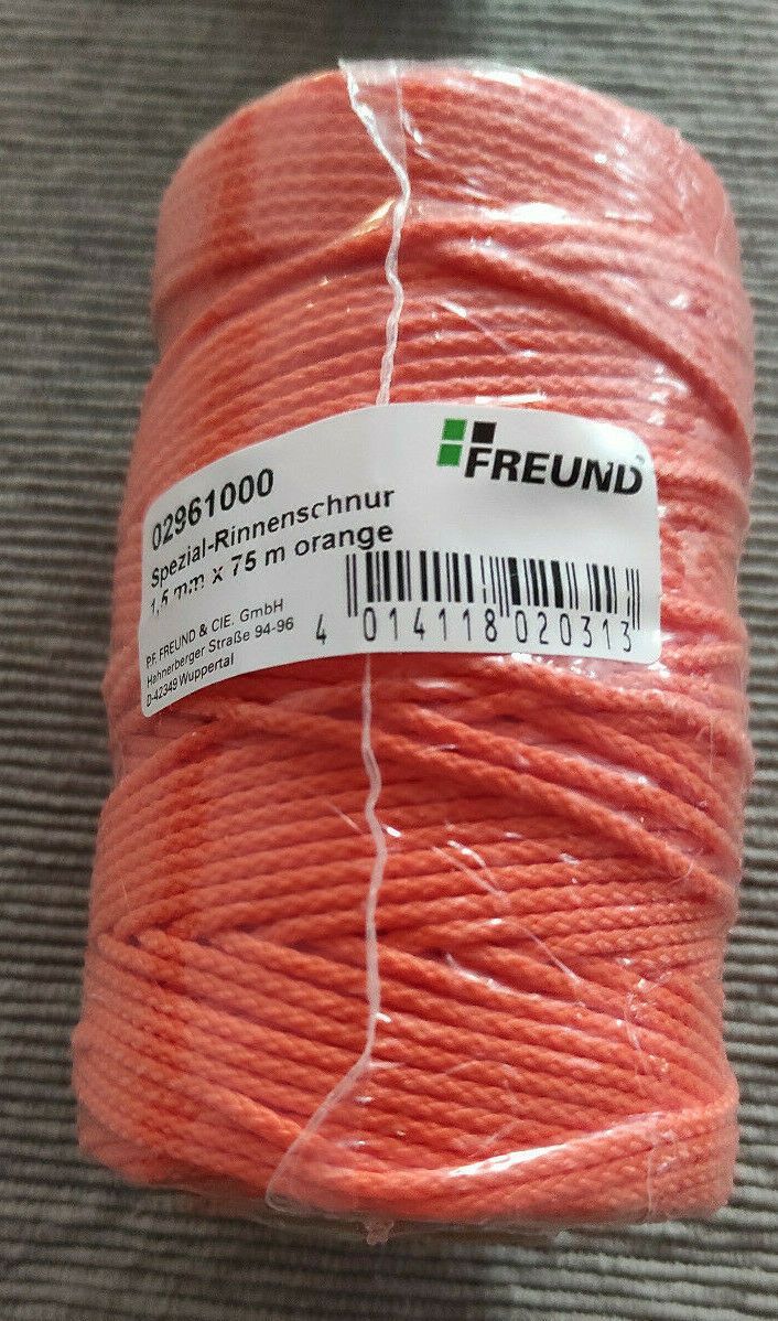 Beschreibung: Rinnenschnur Freund Spezial Rinnenschnur - Farbe:Orange oder Grün je nach Auswahl - eingewebte Einlage kein Durchhängen bei Nässe - extrem Reißfest ohne Nachdehnen - 1,5 x 75 m Beschreibung: Rinnenschnu Abroller Freund Spezial Rinnenschnur-Abroller aus Messing und Holzgriff Sie erhalte