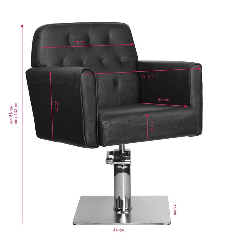 Ein stilvoller Friseurstuhl. Ein sehr komfortables Möbelstück ist ideal für elegante Salons geeignet. Es verfügt über verstellbare Höhe. Es ist stabil und solid. Die Polsterung wurde aus einem hochwertigen Ökoleder in Braun hergestellt. Die Eleganz dieses Möbelstücks wird durch ein eckiges Gestell a