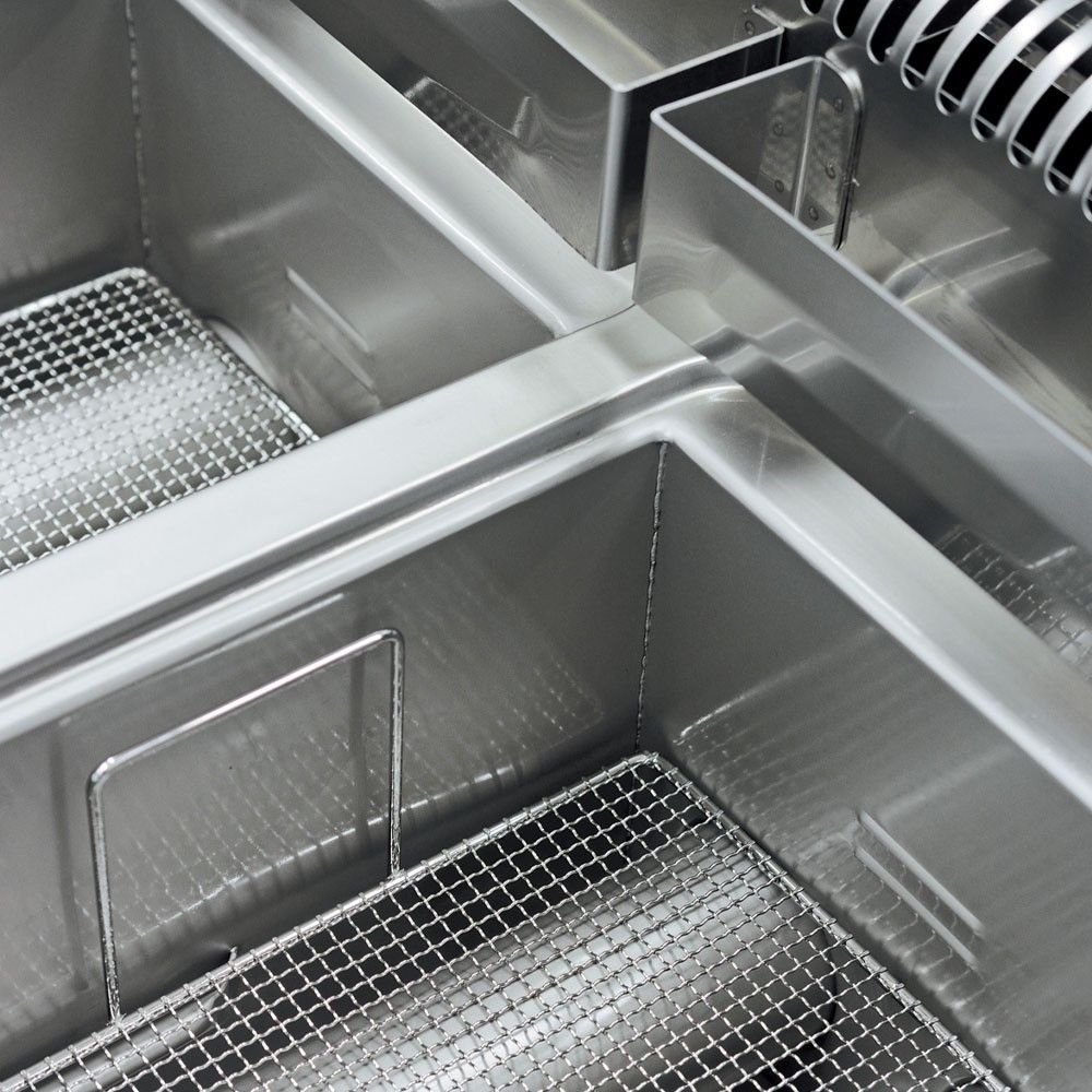 Kraftvolle Fritteuse für Gasbetrieb mit 1 Becken á 8 Liter. 1 Becken abgerundet verwendbare Ölmenge min. 7 Liter, max. 8 Liter Beckenmaß: (BxTxH) 280 x 300 x 230 mm Korbmaß: (BxTxH) 230 x 255 x 110 mm inkl. 1 Korb und 1 Deckel á Becken