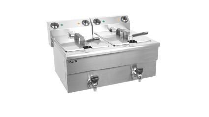 Fritteuse Mod. FE 102 - Material: Edelstahl - Abgerundetes Becken mit Kältezone - Mit Ablasshahn - Stufenlose Temperatureinstellung - Herausnehmbare Heizelemente für eine problemlose Reinigung - Ein-/Ausschalter - Sicherheitsthermostat - Abmessungen inkl. Ablasshahn - Gewicht: 17 kg - Maße: B 600 x T 525 x H 345 - Inhalt: 2x 10 Liter - Temp. 0 / +180 °C - Anschluss: 230 V - 50 Hz - 2 x 3,25 kW