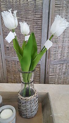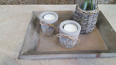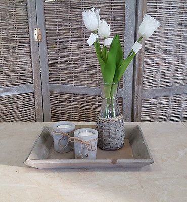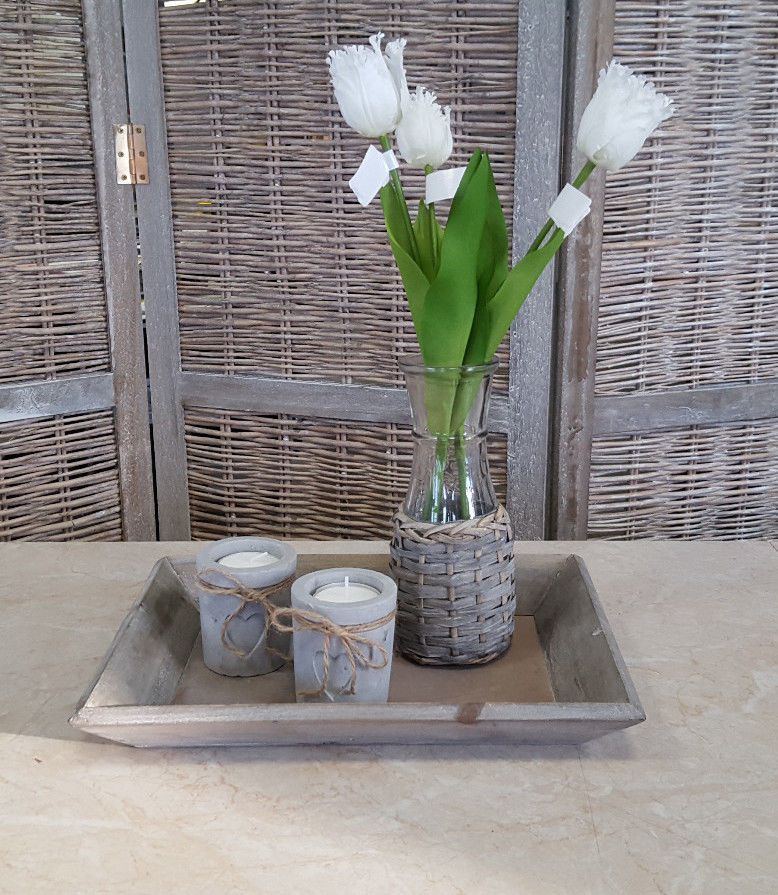 Holztablett Schale flach 29 x 22 cm Gibt es auch komplett dekoriert (siehe Auswahl oben). Die dekorierte Variante mit: 2 Zement-Kerzenhaltern grau, 1 Korbgeflecht-Vase 18x8 cm, 3 Papageientulpen (Kunstblume) weiß Ideal als Geschenk oder als Tischdeko für zu Hause.