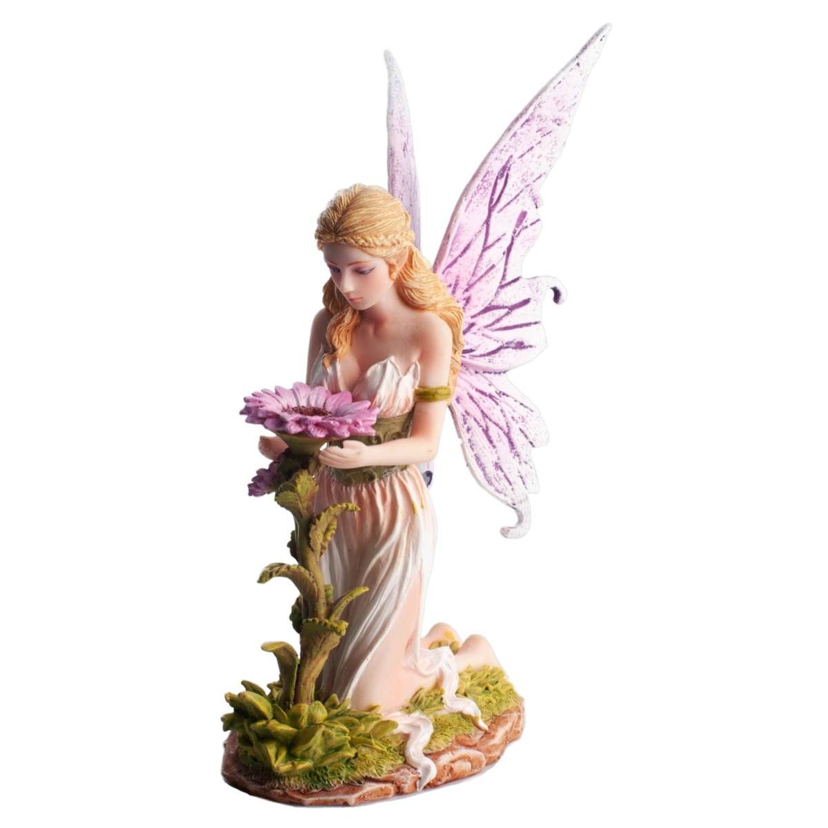Frühlingsfee Florina kniet schützend vor Blume
