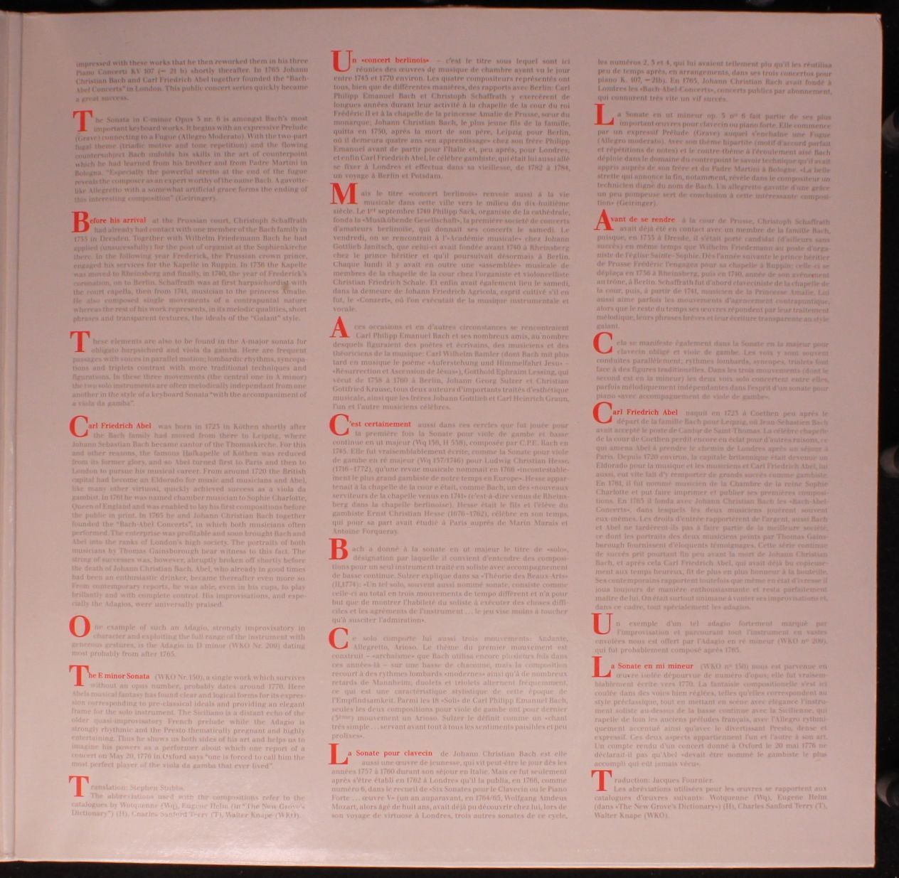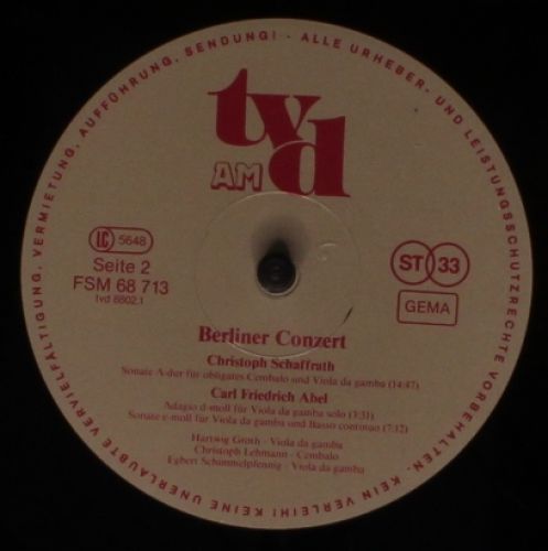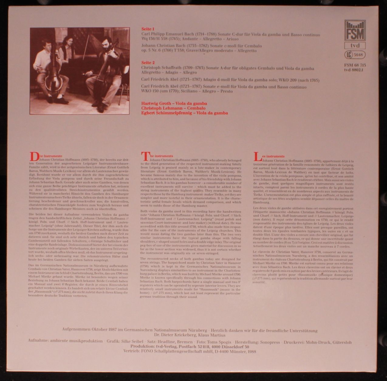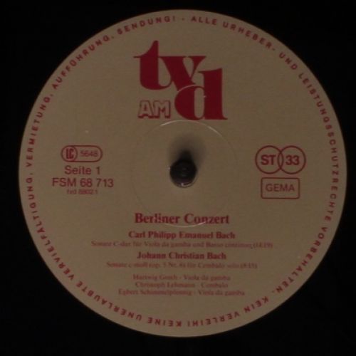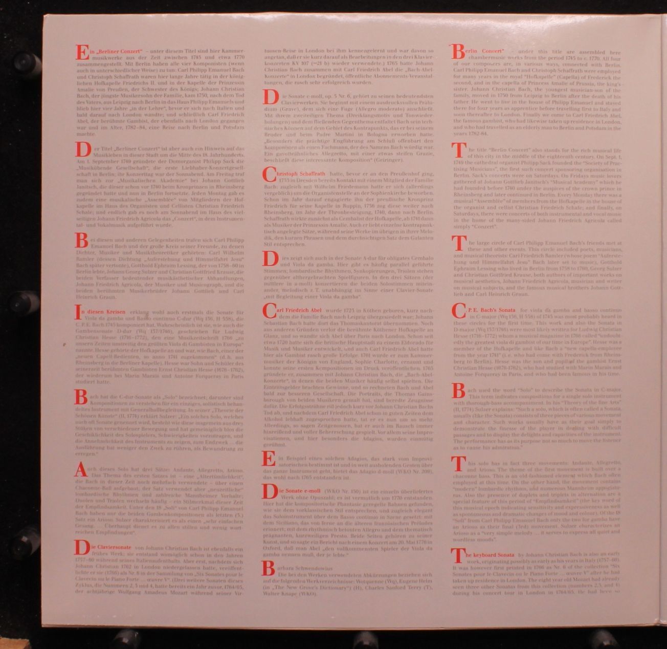 Condition Vinyl Near Mint (NM or M-) Condition Sleeve Near Mint (NM or M-) Tracks included: I 1. Sonate C-Dur Für Viola Da Gamba Und Basso Continuo Wq 136 H 558 (1745); Andante - Allegretto - Arioso Composed By : Carl Philipp Emanuel Bach 2. Sonate C-Moll Für Cembalo Op. 5 Nr. 6 (1766) T338: Grave A