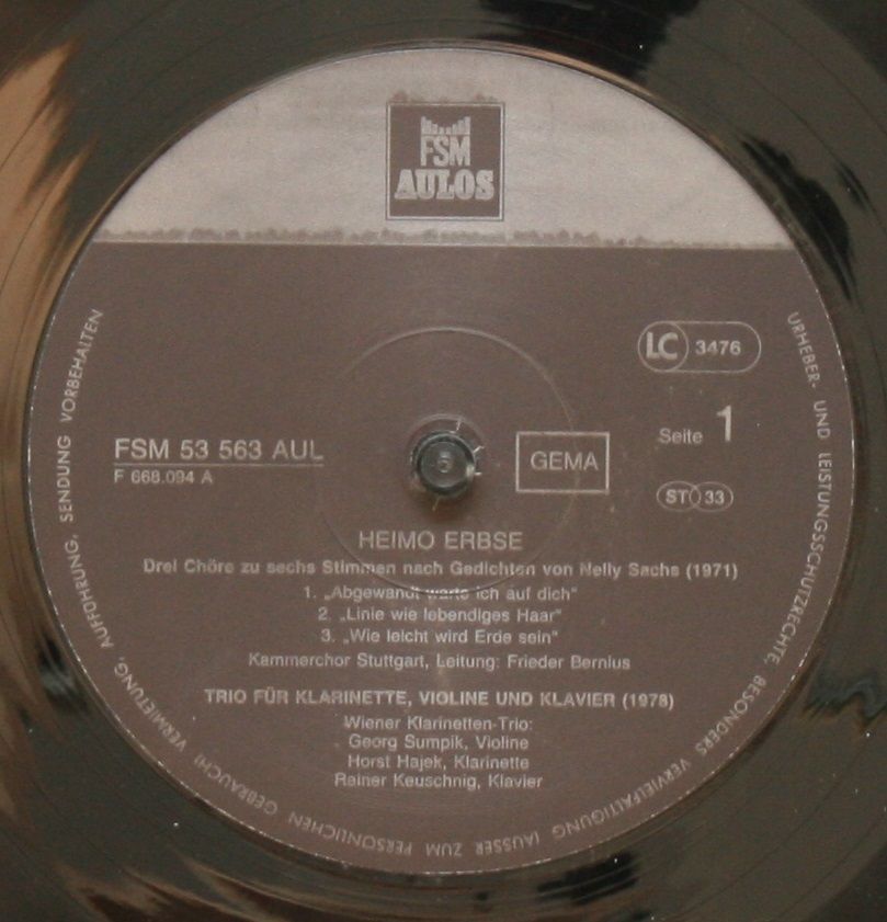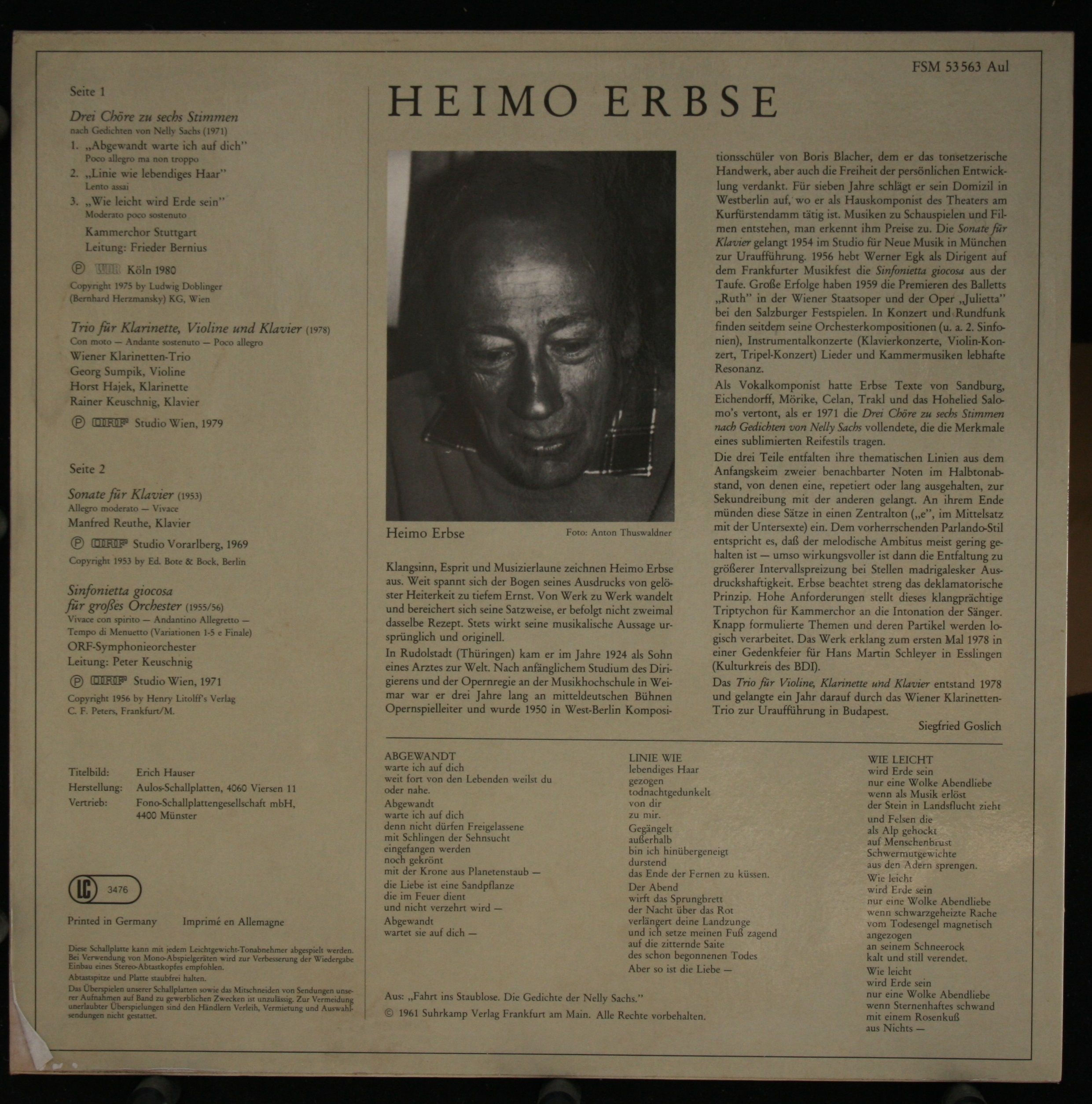 Condition Vinyl Near Mint (NM or M-) Condition Sleeve Very Good Plus (VG+) Tracks included: Drei Chöre Zu Sechs Stimmen (1971) Nach Gedichten Von Nelly Sachs Conductor : Frieder Bernius Orchestra : Stuttgarter Kammerorchester I 1. > Abgewandt Warte Ich auf Dich 2. > Linie Wie Lebendiges Harr 3