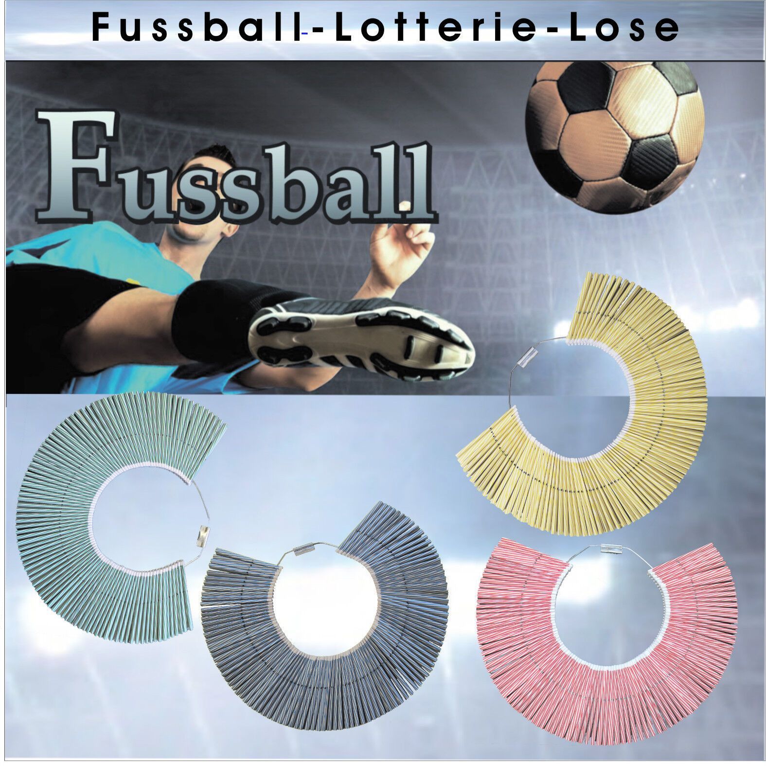 Jetzt werden die Fussballspiele noch spannender ! 100 Stück Fussball-Lose am Ring in 3 Farben Farbauswahl: rot weiss, grün weiss, gelb weiss (Bitte gewünschte Farbe oben auswählen! ) Die Lose können z. B. bei Heimspielen Ihres Fußballvereins verkauft werden oder auch in Sportbars, Gaststätten, am Ar