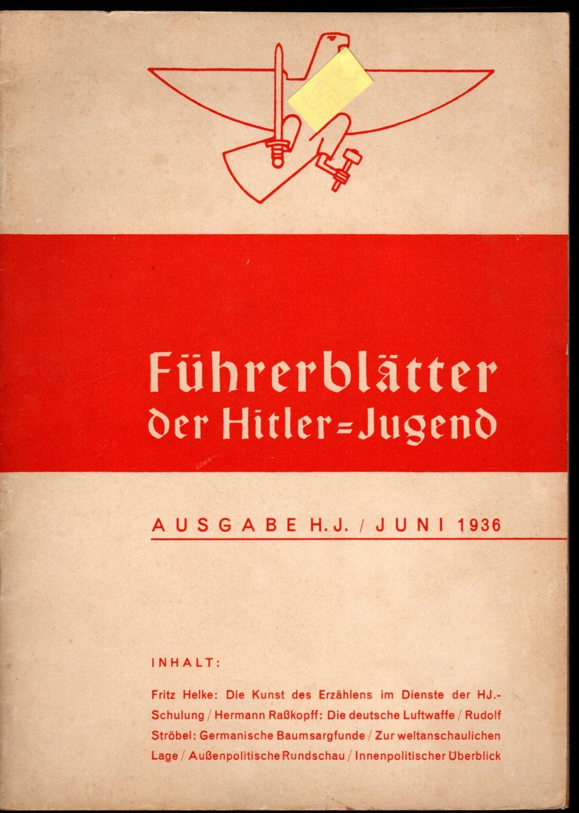 Führerblätter der HJ - Ausgabe H.J. Juni 1936 R. Führerblätter der Hitlerjugend - Ausgabe H.J. Reichsjugendführung der NSDAP, Amt für weltanschauliche Schulung * 32 Seiten Zustand: akzeptabel - gebraucht mit altersbedingten Gebrauchsspuren (kleinere Beschädigungen kommen vor, sowie gebräunte Seiten) Dieses Heft wird nur zur staatsbürgerlichen Aufklärung und zur Abwehr verfassungswidriger Bestrebungen angeboten (§86 StGB).