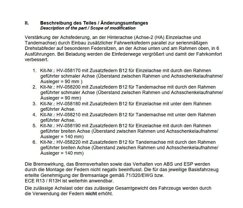 MAD Zusatzfedern für die Hinterachse für Niesmann Bischoff Reisemobil - Wohnmobil mit AL-KO AMC Hinterachse Bitte beachten Sie: - nicht für Fahrzeuge mit serienmäßigen Luftfahrwerk, ALC Level Controller, SLC, lastabhängigem Bremsdruckregler, Tandemachse Der ordnungsgemäße Einbau muss durch eine zugelassene Prüforganisation bestätigt werden. Lieferumfang: 1 x MAD Zusatzfedern Kit HA Teilenummer: HV-058170