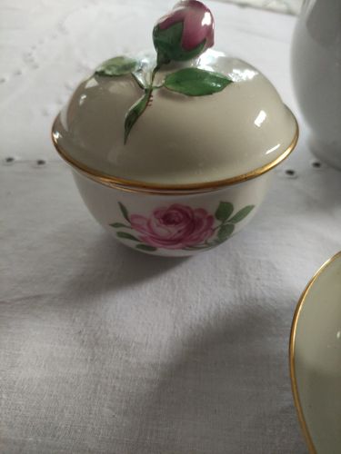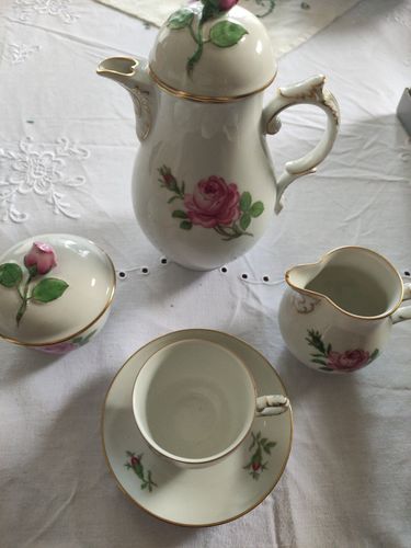 Sie erhalten ein sehr schönes Fürstenberg Porzellan Mokkaservice Service 15 Teile 6 Personen.Muster rote Rose Hergestellt um 1950-60. Das Mokkaservice ist gut erhalten. Sie erhalten 1 Mokka-Kanne 1 Zuckerdose 1 Milchgießer 6 Tassen 6 Untertassen. Leichte Gebrauchsspuren bitte sehen sie sich vor Gebo