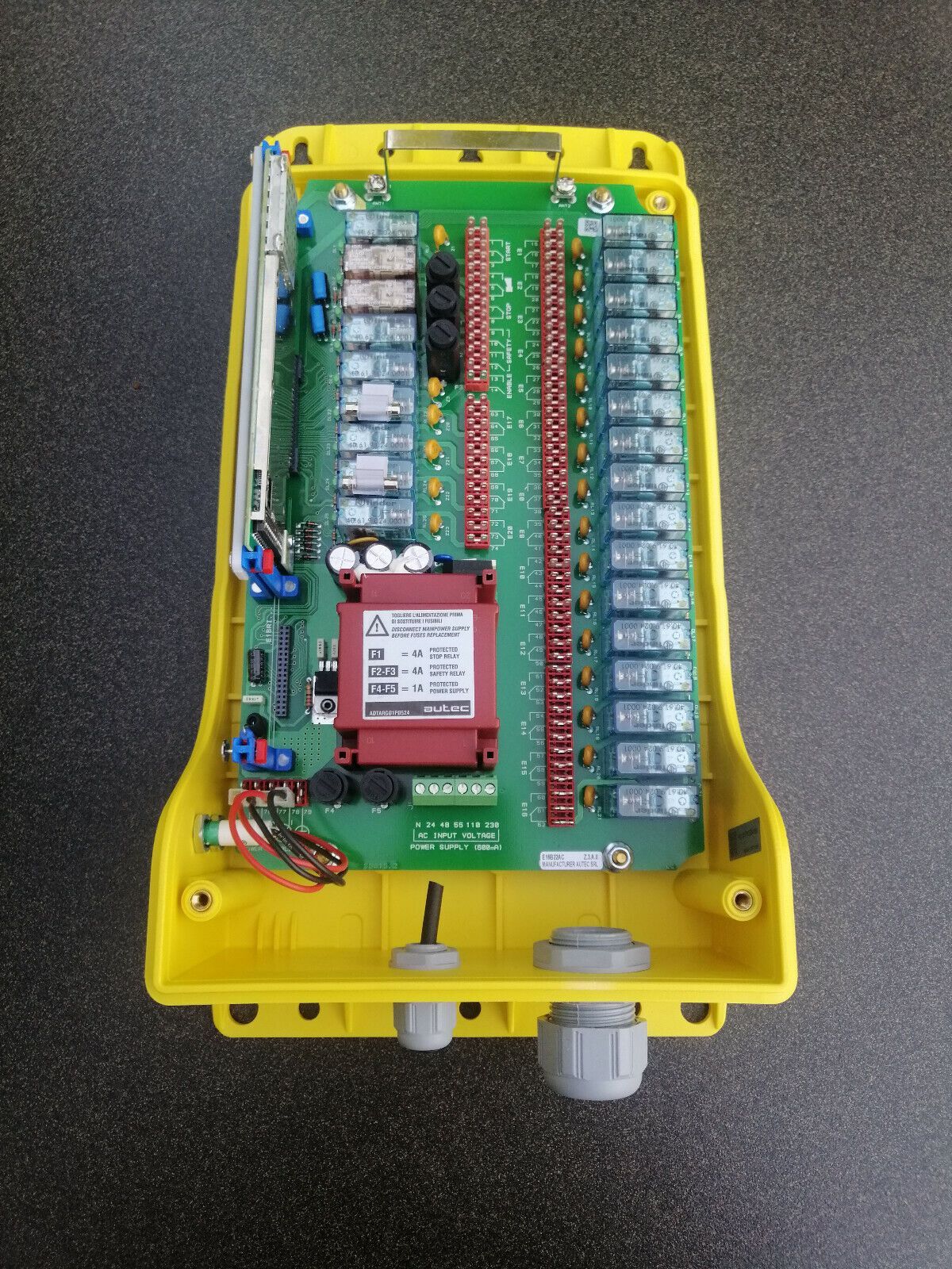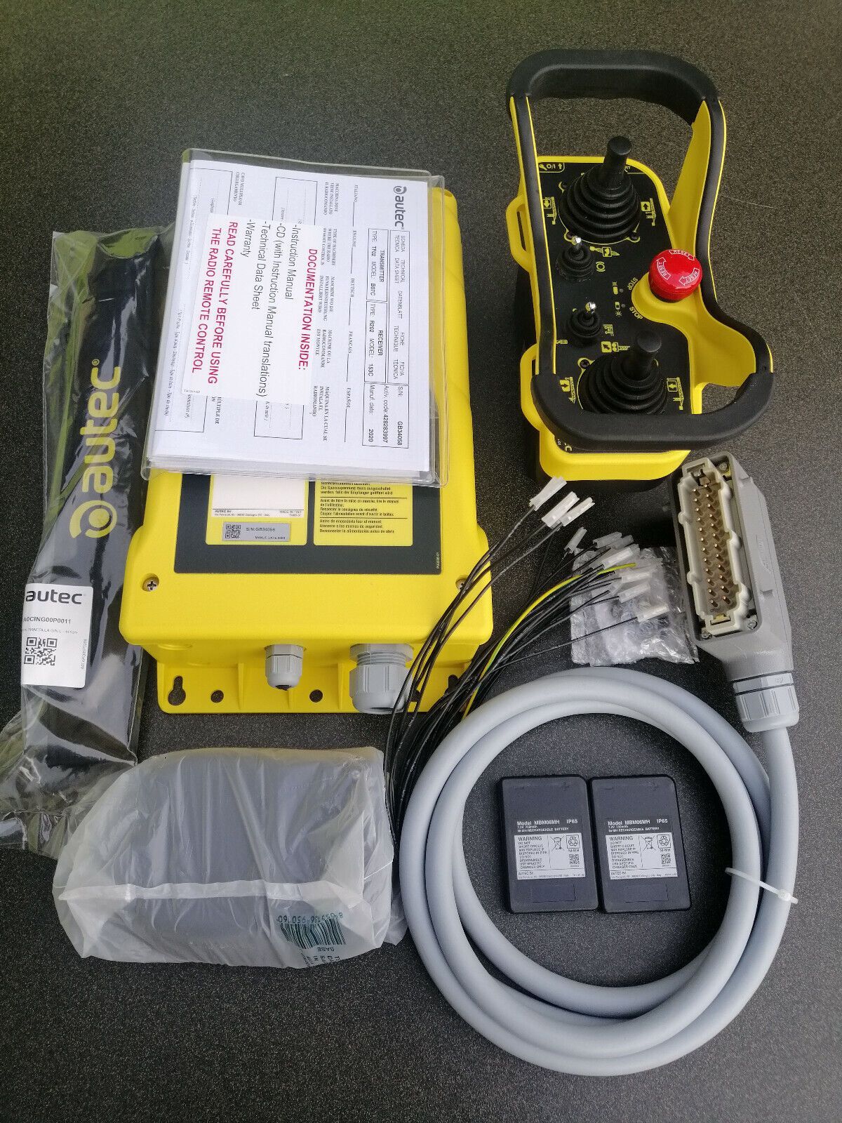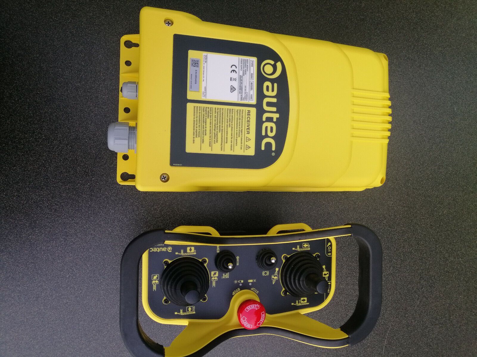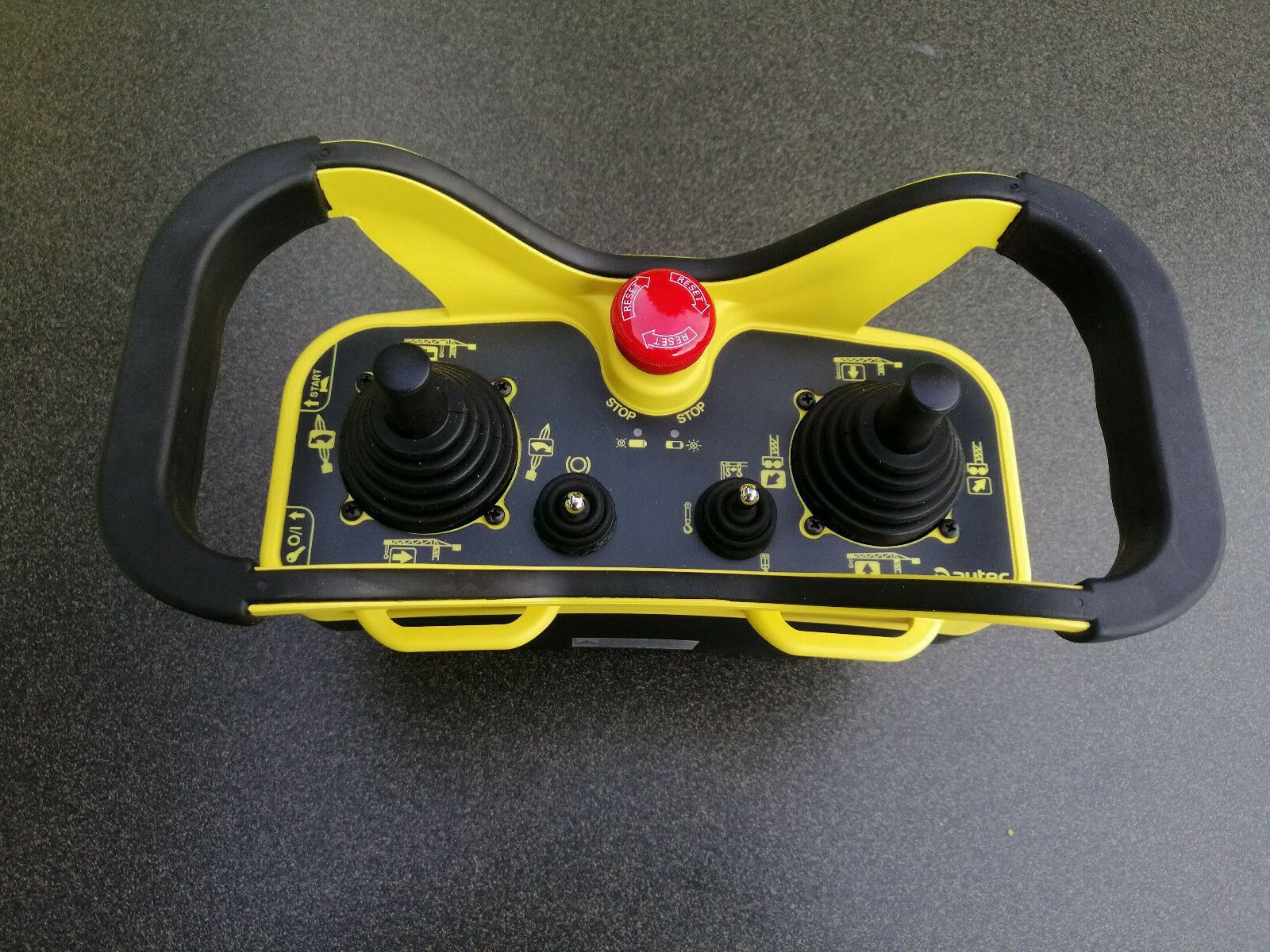 Biete hier: neue Funkfernsteuerung für Baukrane Autec Sender MJ-02 mit 2 Kreuzhebel Meisterschaltern (4-0-4 3-0-3) (1-0-1 5-0-5) , 1 Kippschalter R - 0 - T , 1 Taster 0 - R ( Bremse ) 1 Drucktaster seitlich ( Start Hupe ) 1 Schlüsselschalter 0 - R 1 Stop Taster ( drehentriegelt ) Empfänger Type B 20