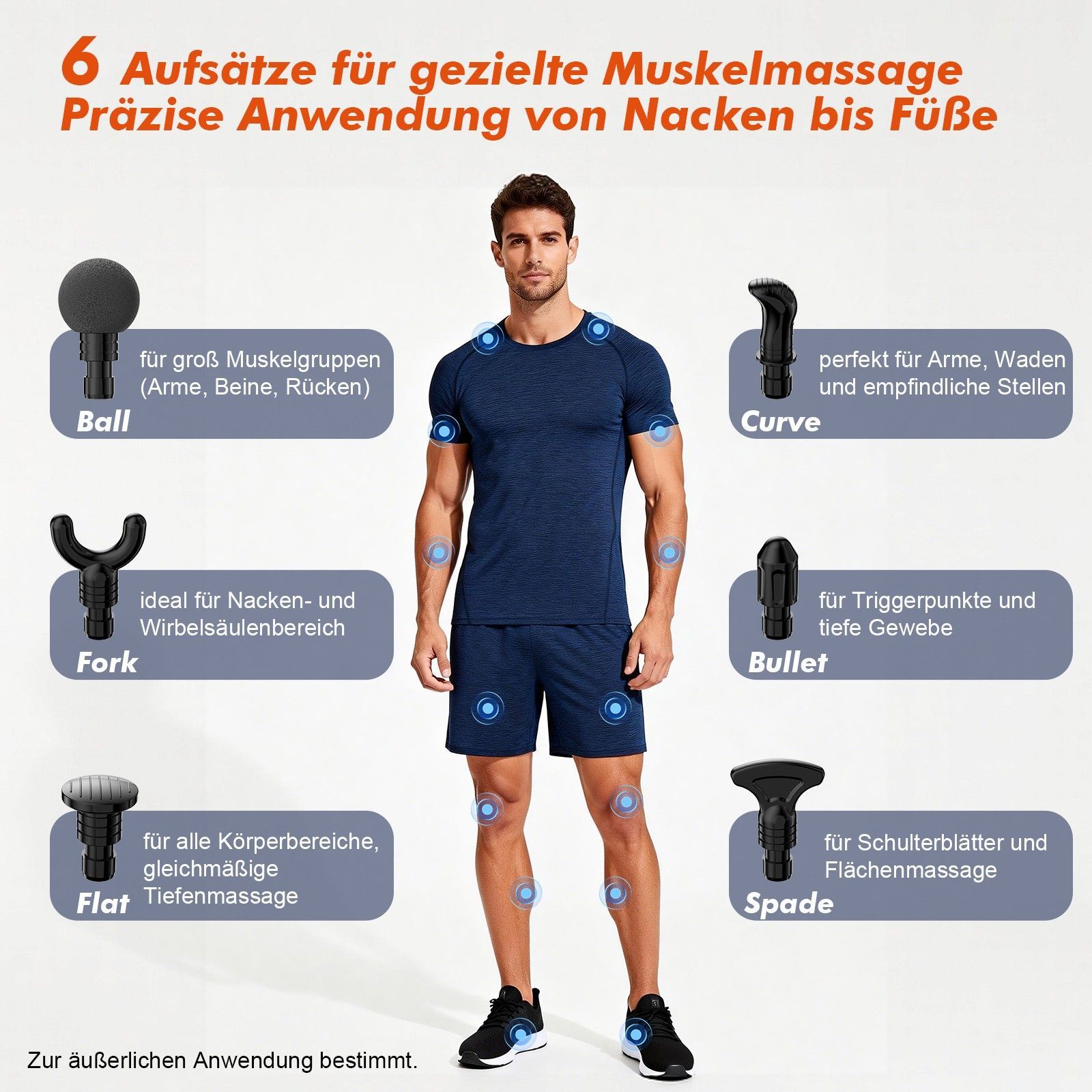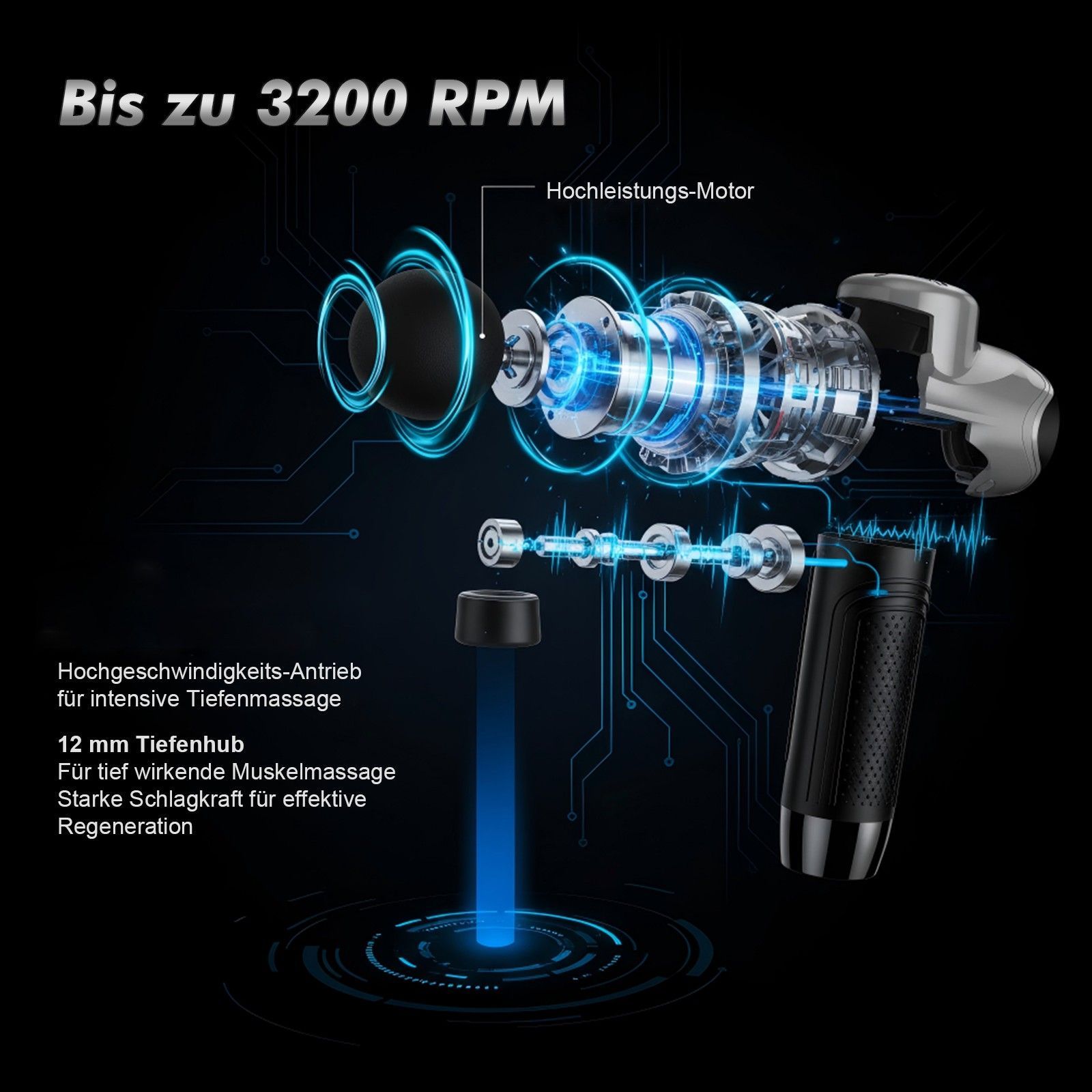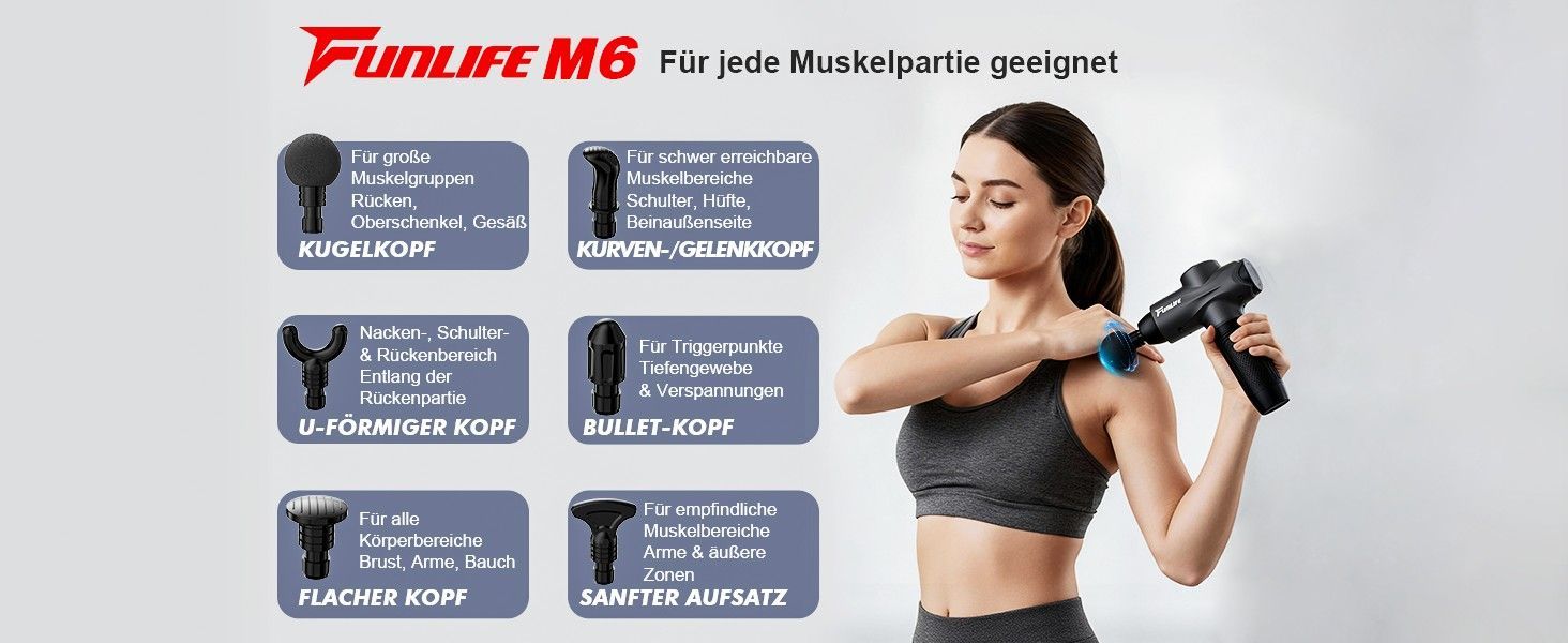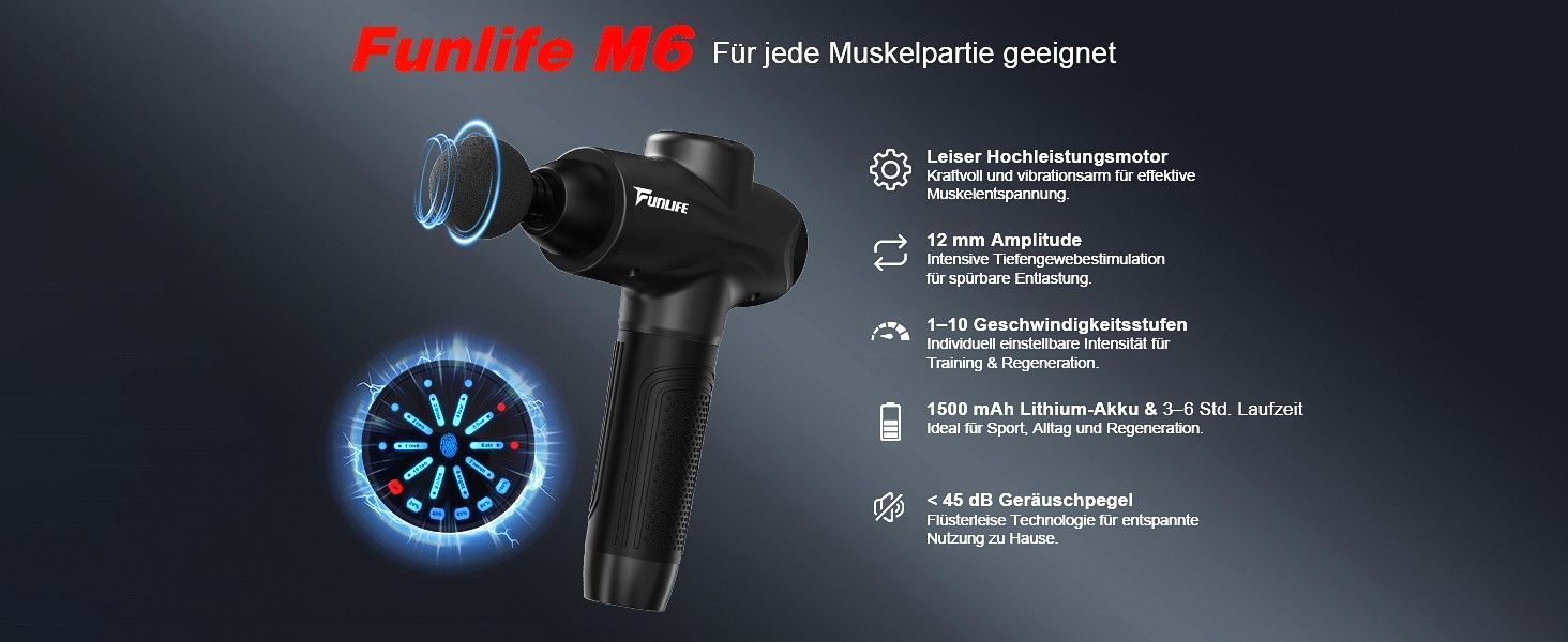 FunLife M6 Massagepistole, 3200RPM Hochleistungsmotor, 12mm Tiefenhub, 6 Massageköpfe