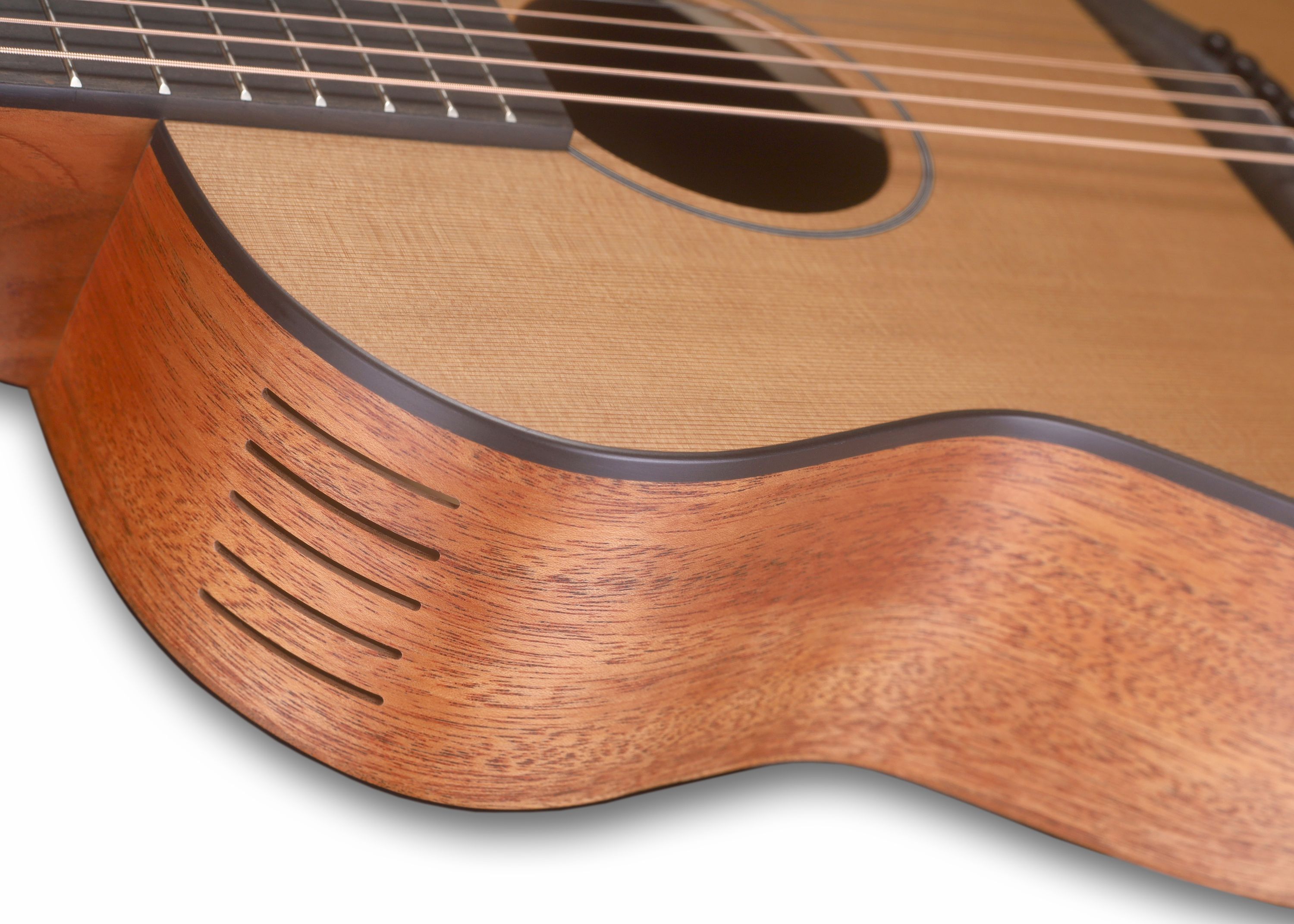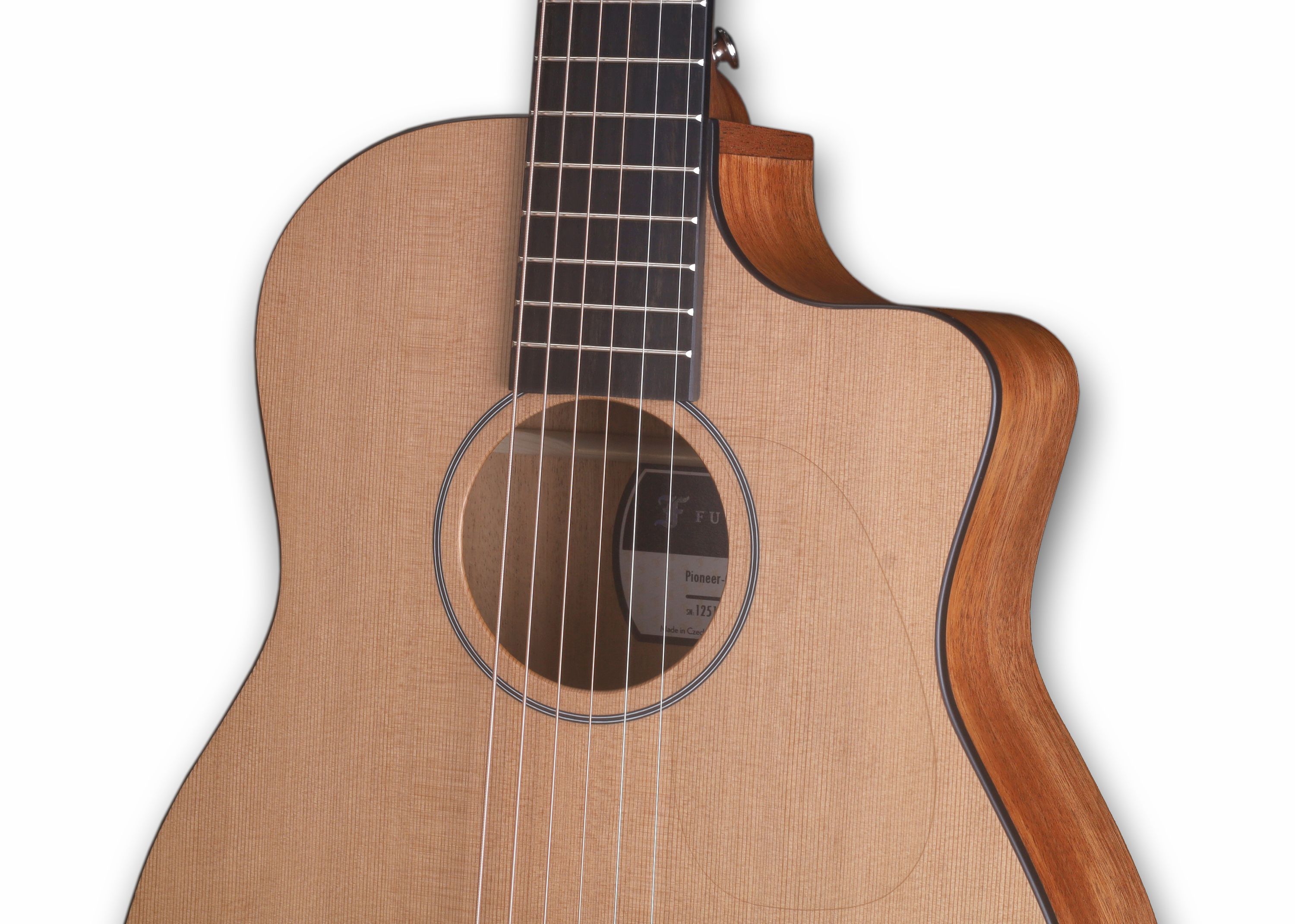 Furch Pioneer-CM Korpusform: Pioneer Cutaway mit Soundport Decke: Zeder, massiv Boden und Zargen: Mahagoni, massiv Hals: Mahagoni Griffbrett: Ebenholz Mensur: 61,5 cm Sattelbreite: 45 mm Steg: Ebenholz Schlagbrett: Transparent Farbe: Natur Finish: Open Pore mit Furch CNR-Active System inkl. Gigbag M