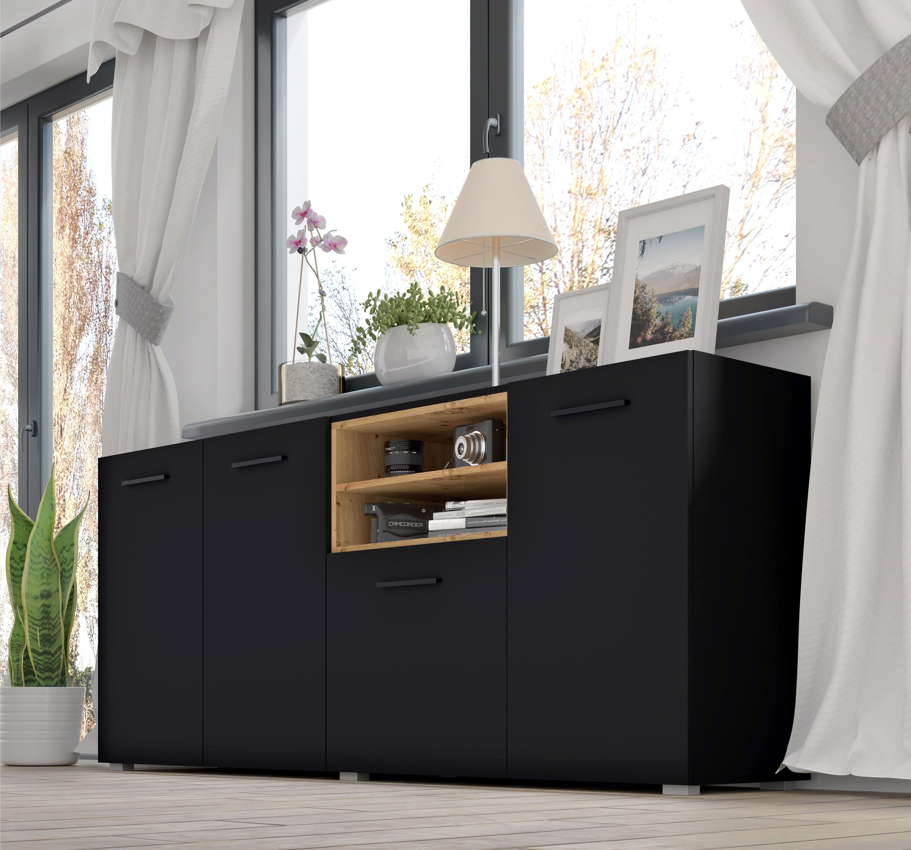 Selsey Bemmi - Sideboard Kommode 3-trig, Schwarz, 150 cm