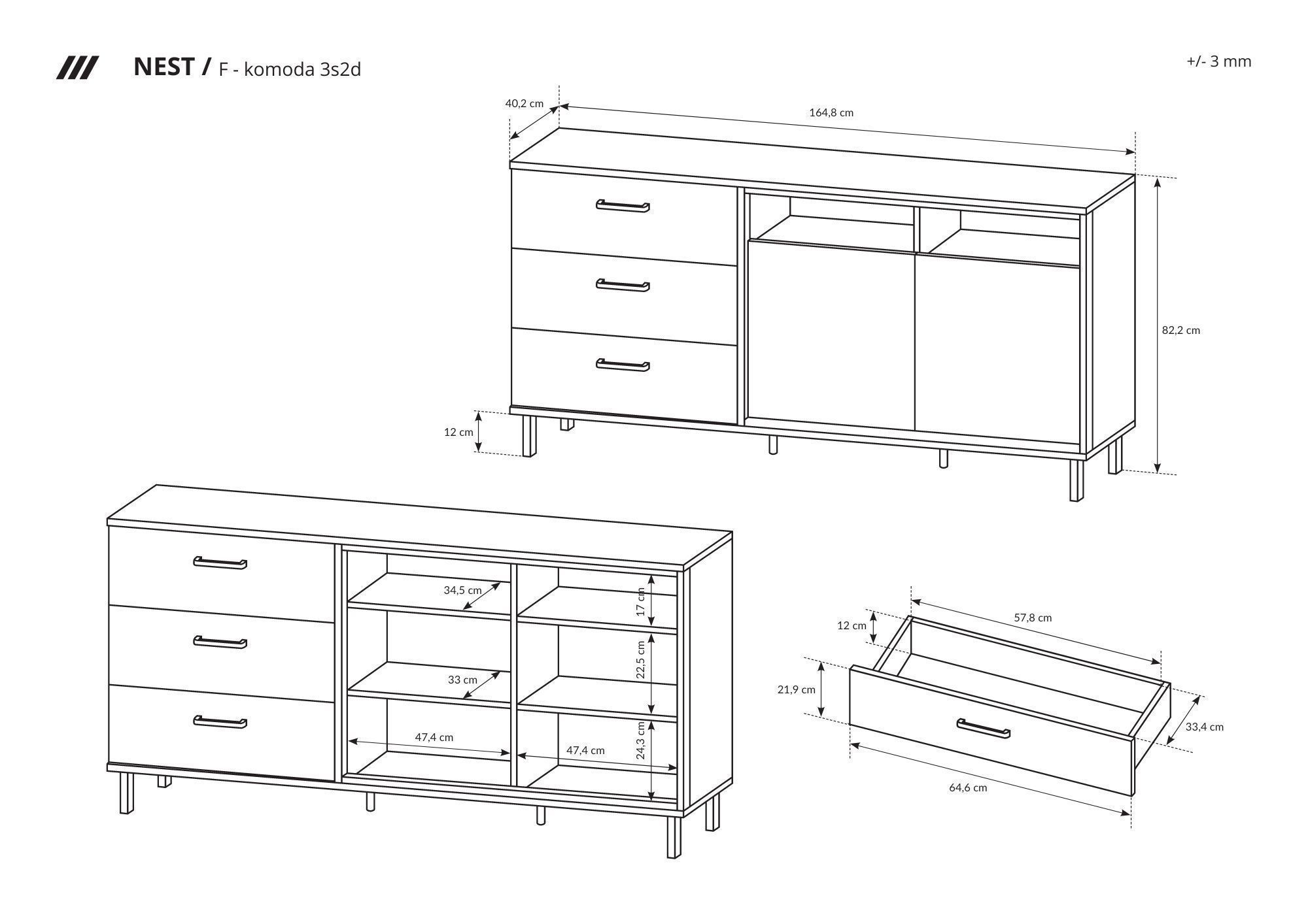 • Kommode Tireno 3SZ Sideboard mit drei Schubladen Highboard M24