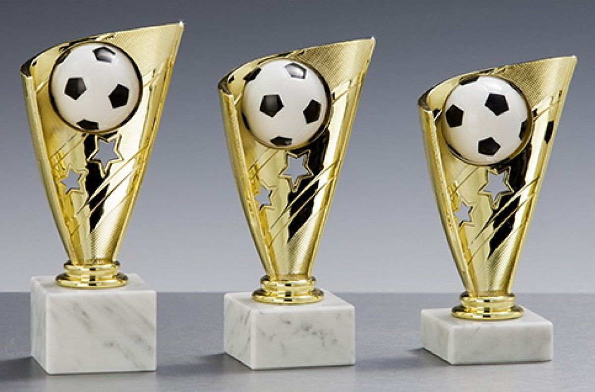Material Kelch: Kunststoff gold mit eingearbeiteten Fußball Material Sockel: heller Marmor Größen: 15 cm, 16 cm, 17 cm