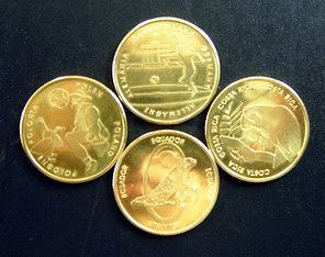 Fußball WM 2006: 4 Medaillen, Neu, 4 offizielle deutsche Medaillen der FIFA Fussball-Weltmeisterschaft Deutschland 2006. Mit Motiven der Mannschaften der (deutschen) Gruppe A der WM 2006 (Costa Rica: Motiv Papagai, Ecuador: Motiv Leguan, Deutschland: Motiv Brandenburger Tor, Polen: Motiv Gänse, die