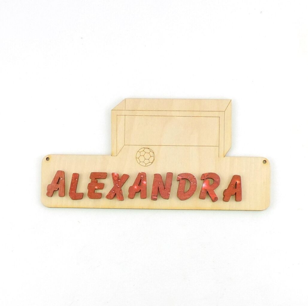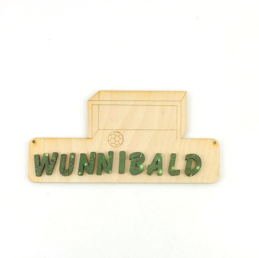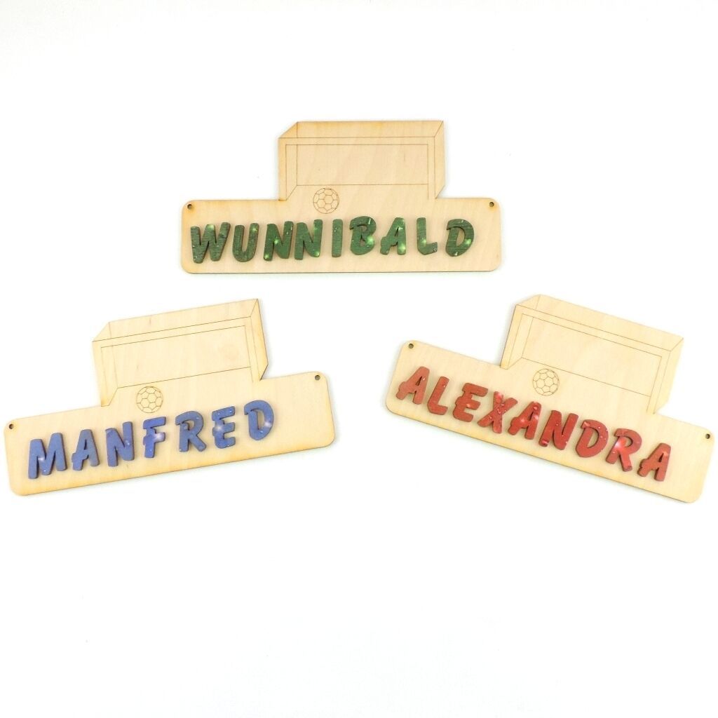 Türschild Fussballtor Das Türschild aus Sperrholz ist 18 cm lang und 3 mm stark. Optional mit Buchstaben 21 mm oder 30 mm in natur. Damit Sie das Türschild besser gestalten können, erhalten Sie dazu Ihren gewünschten Namen mit losen Buchstaben. Bitte geben Sie nach dem Kauf an, welcher Name mitgesen