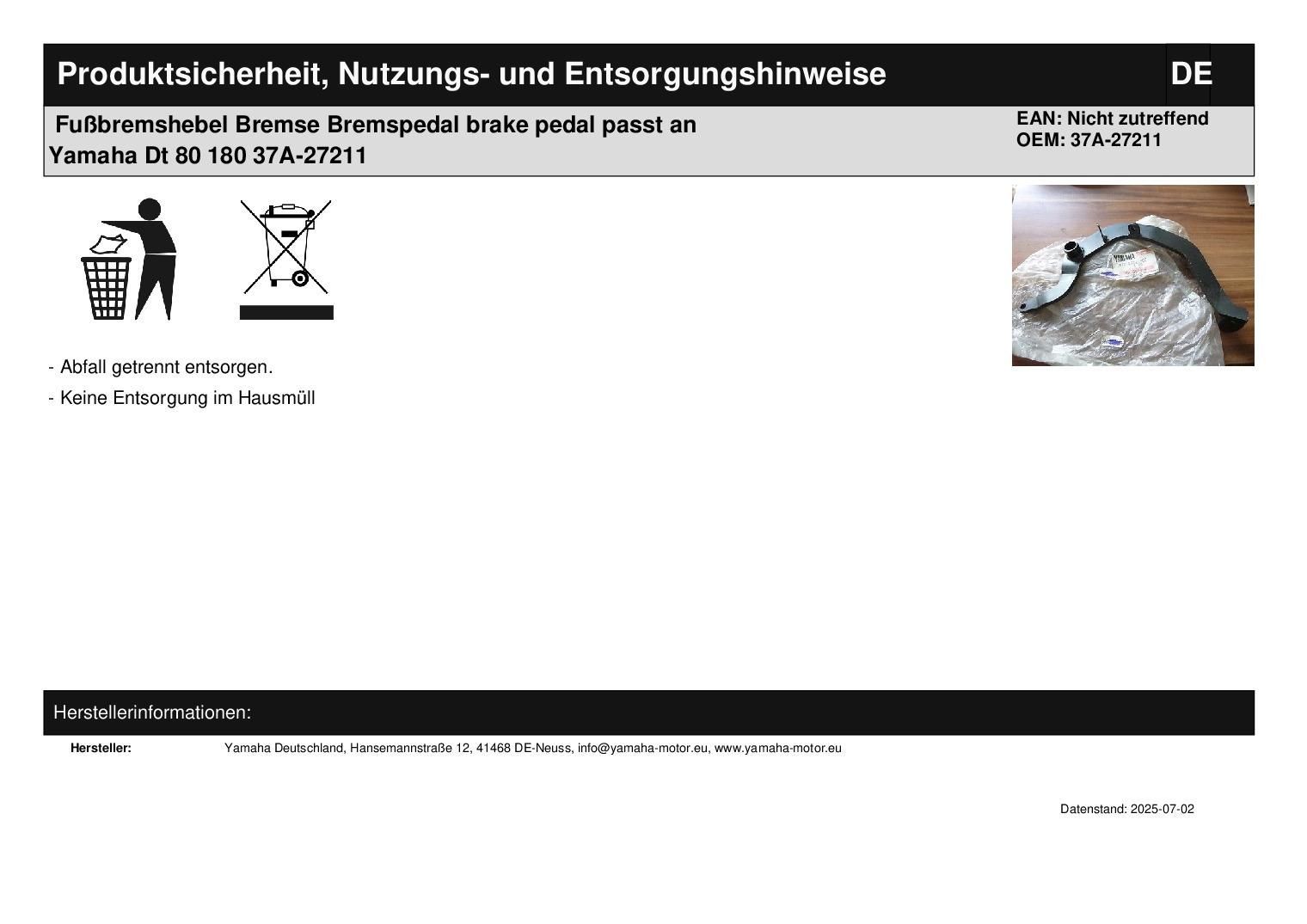 Fußbremshebel Bremse Bremspedal brake pedal passt an Yamaha Dt 80 180 37A-27211 In dieser Auktion gibt es folgenden Artikel zu kaufen: originaler Fußbremshebel (siehe Foto) Modell: passend für Yamaha DT 180 Lc, DT 80 Lc1 Bj.: unbekannt Lieferumfang: 1 Stück Artikelzustand: neu aus Geschäftsauflösung