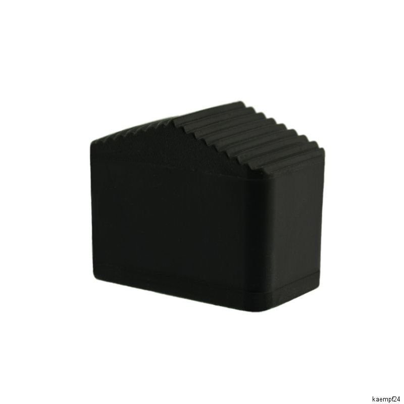 1 x Fusskappe 36 x 20 mm schwarz Ausführung: Sehr stabile Fusskappe aus robustem Kunststoff für Metallrohr 36 x 20 mm rechteckig ( Rohraußenmaß ! ) mit zweiseitig abgeschrägter Standfläche ( 15° Grad ) Maße: Innenmaß: 36 x 20 mm Außenmaß: 40,0 x 23,5 mm Höchste Höhe: 33,5 mm Niedrigste Höhe: 26,
