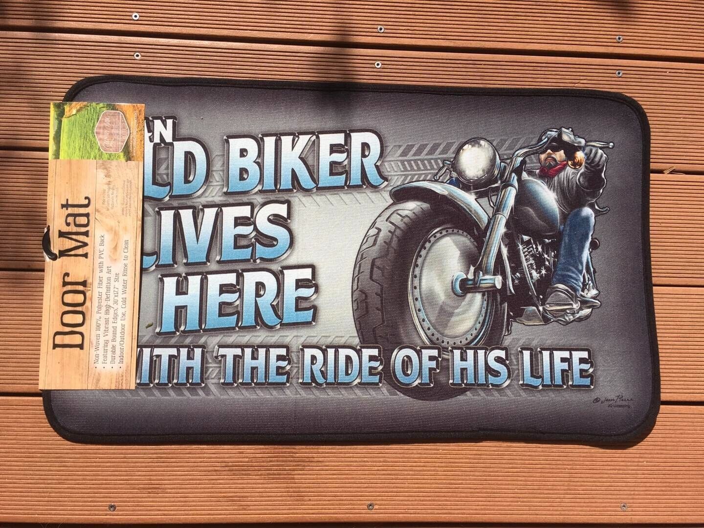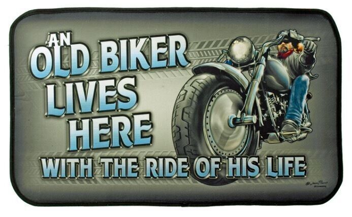 An old Biker lives here - with the ride of his life Welcome Mat - Qualitativ hochwertige Fußmatte - Offiziell lizenziert - Maße: 44 x 75 cm - Material: Oberseite Polyester - Unterseite PVC Für in + Outdoor Gebrauch Versand Euro 6,--
