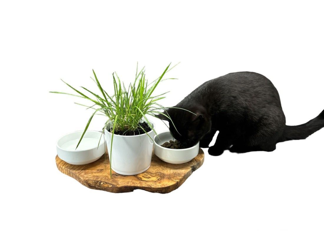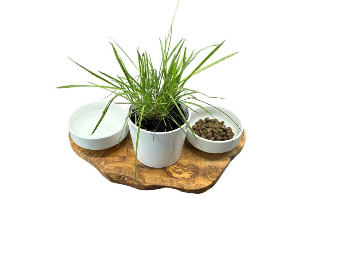 Schicke Futterstation für die Katze. Passt in jeden Flur oder Wohnzimmer. Das Set hat 2 Schalen mit 0,4 Liter Inhalt und einen Übertopf für Katzengras. Die Schalen können für die Reinigung herausgenommen werden. Sind Spülmaschaschinen geeignet. Durch Anti-Rutsch-Pads kann der Sockel beim fressen nicht verrutschen. Die Maße des Sockel sind ca.: 40-45 cm lang und ca.: 15 cm breit.