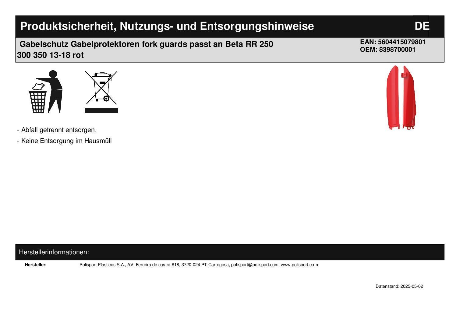 Polisport Gabelschutz Gabelprotektoren fork guards passt an Beta RR 250 300 350 13-18 rot