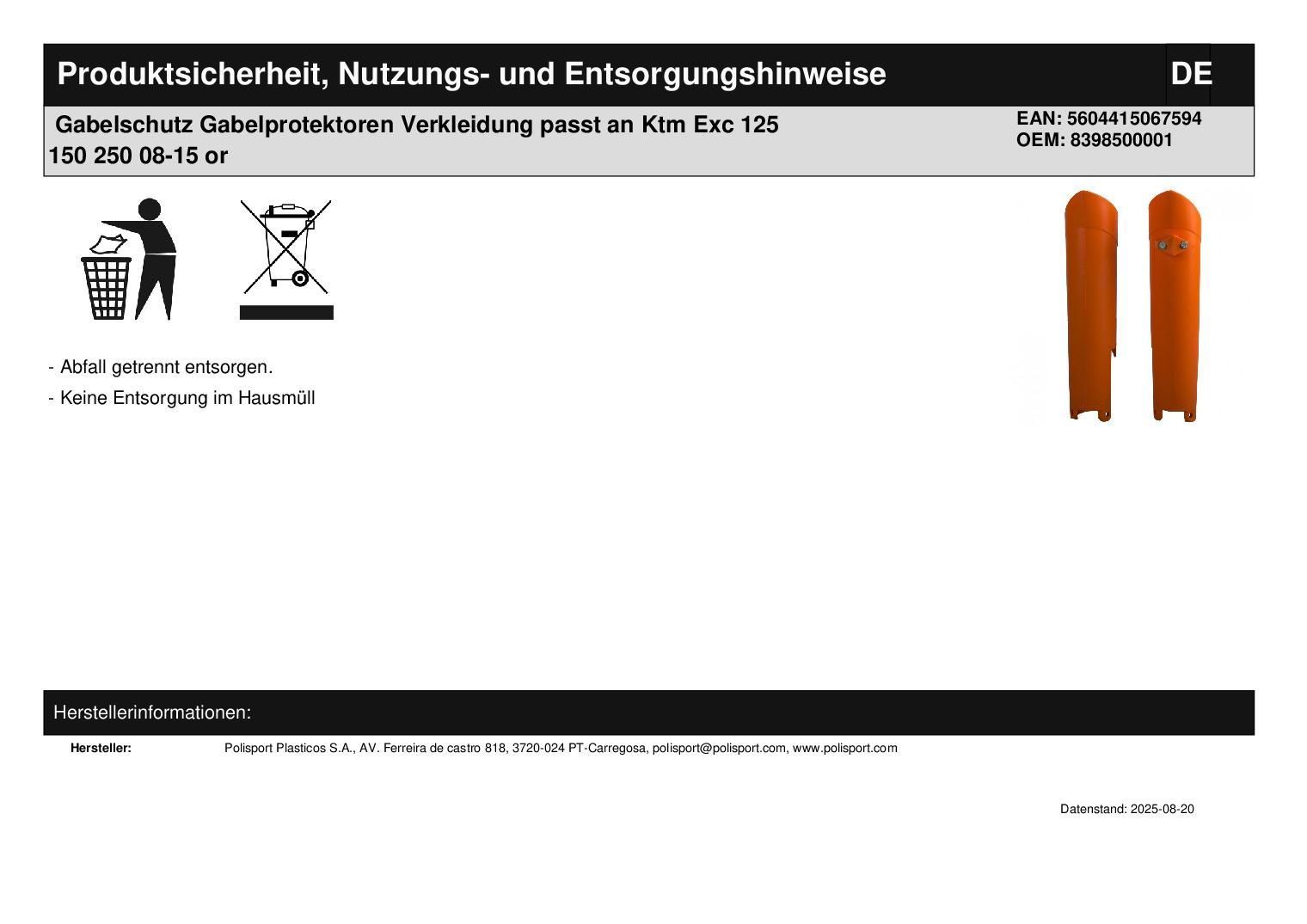 Polisport Gabelschutz Gabelprotektoren Verkleidung passt an Ktm Exc 125 150 250 08-15 or