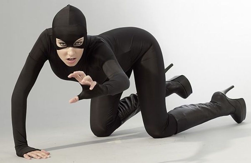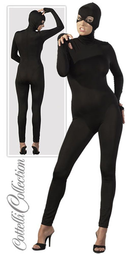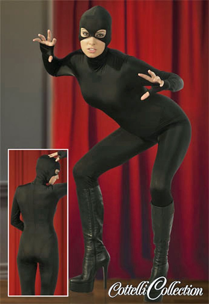 Hautgenau sitzender Ganzkörperanzug (ohne Fuß) mit durchgehendem Reißverschluss vom Rücken bis zum Kopf. Maske mit Augenöffnungen. Angenähte Handschuhe mit freien Fingerkuppen. Farbe: Schwarz. Material: 95% Polyester. 5% Elasthan. Größe: L, XL.