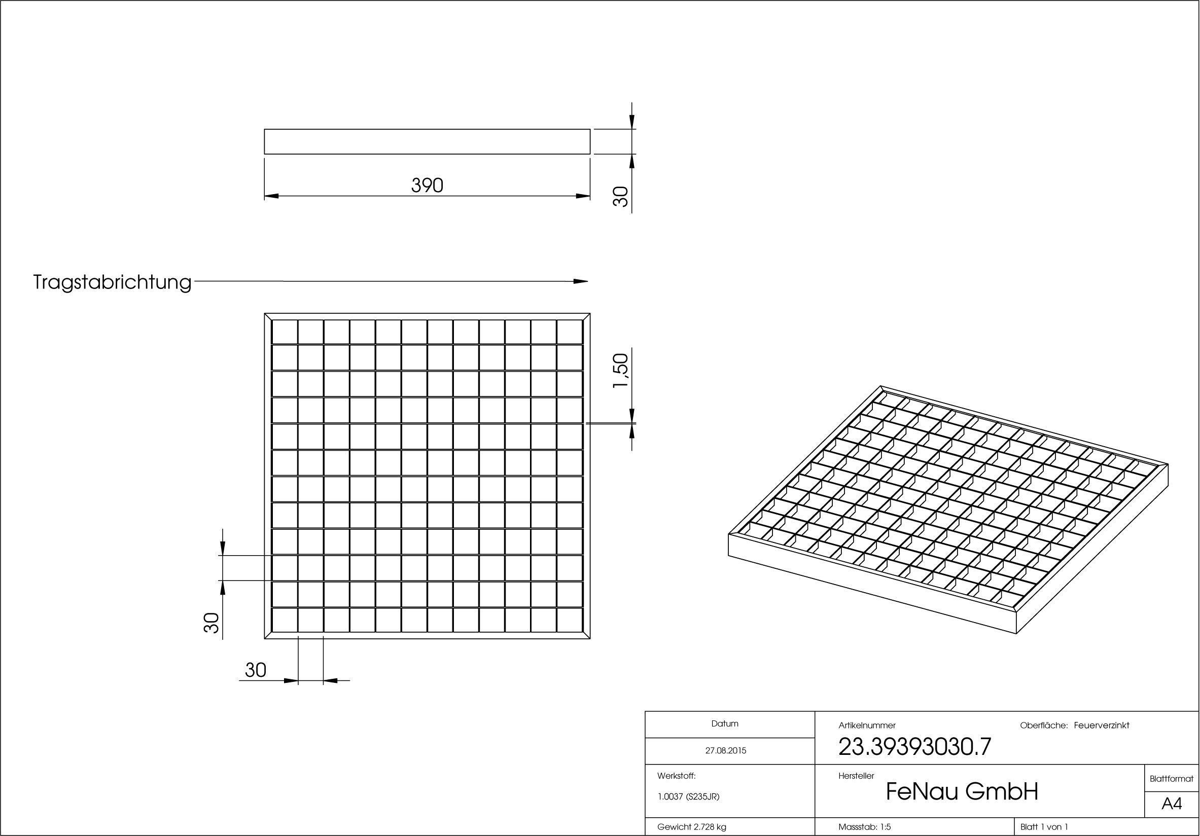 Garagen-Gitterrost | Maße: 390x390x30 mm 30/30 mm | aus S235JR (St37-2), im Vollbad