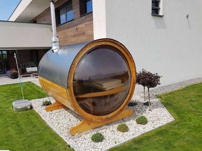 GardenAndPoolsCom Gartensauna Sauna Hütte Fass Outdoor Sauna Panorama BIG 5 x 2,4 m